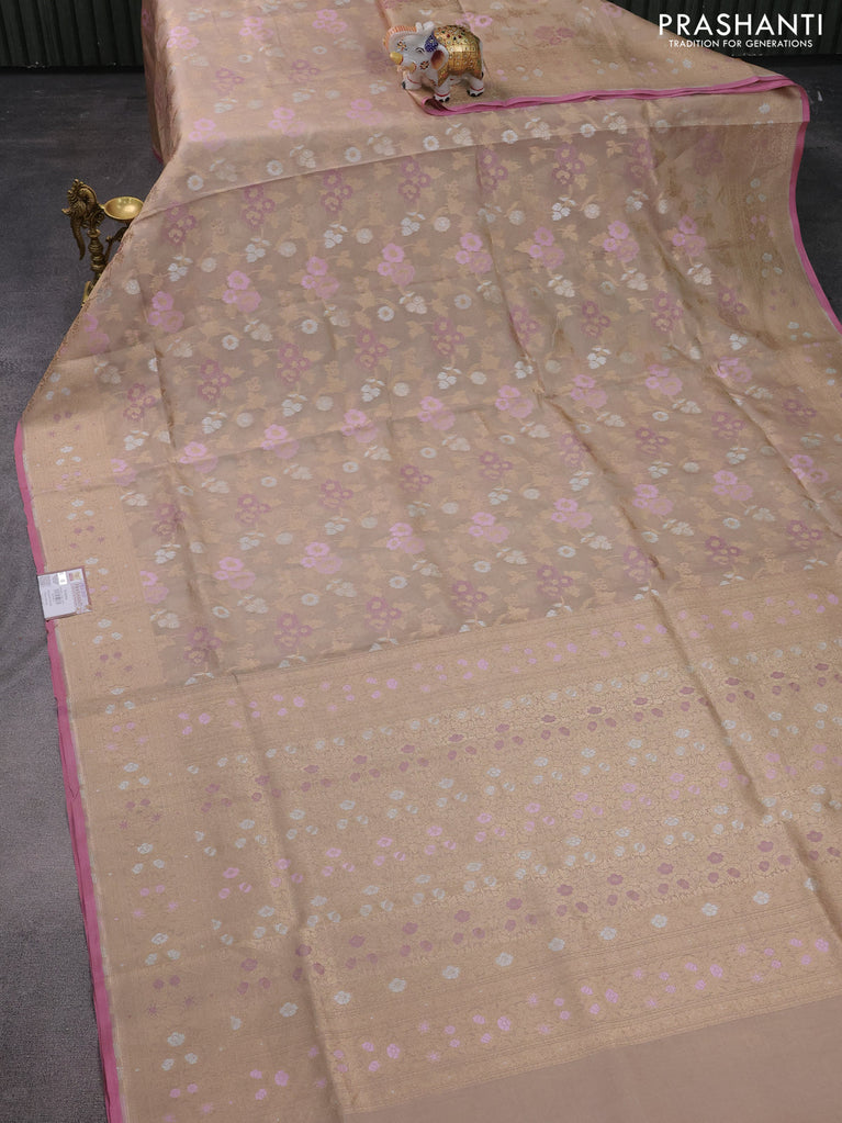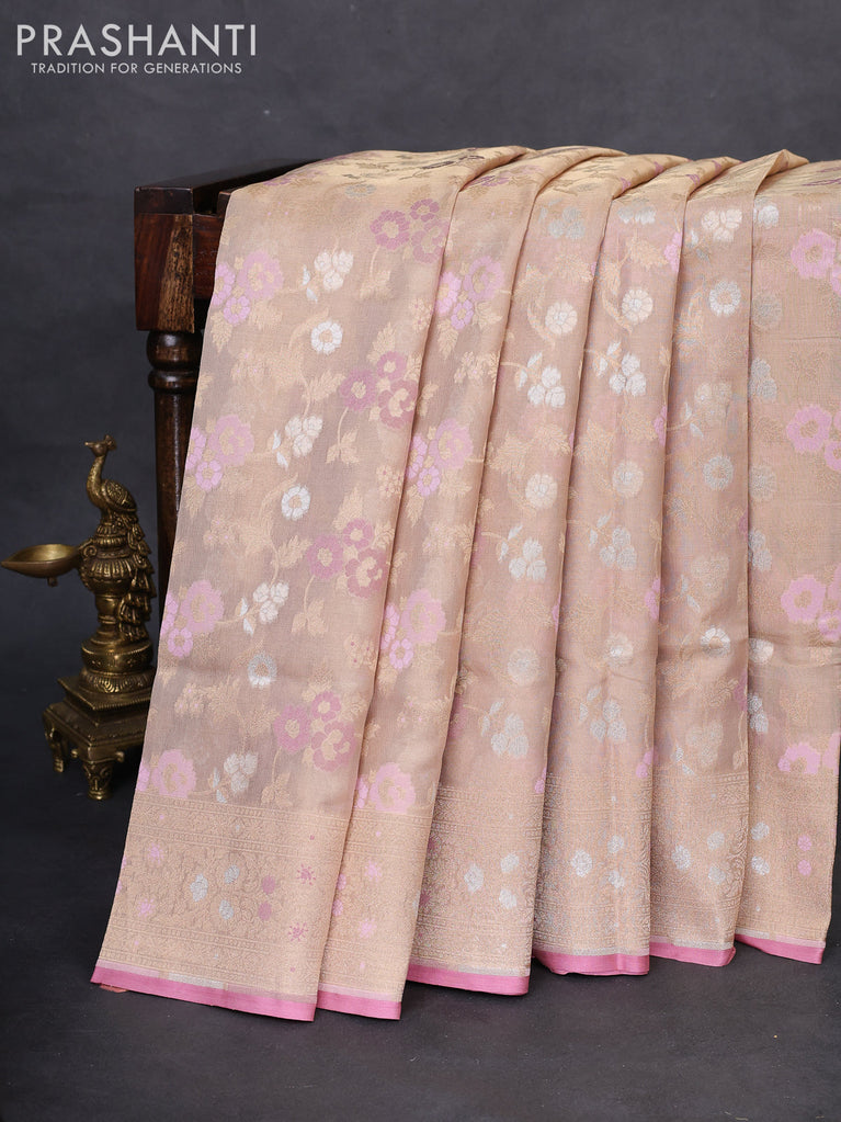 Banarasi tissue silk saree sandal and peach pink with allover thread & zari woven floral weaves and zari woven border