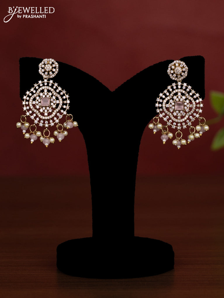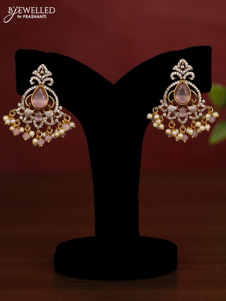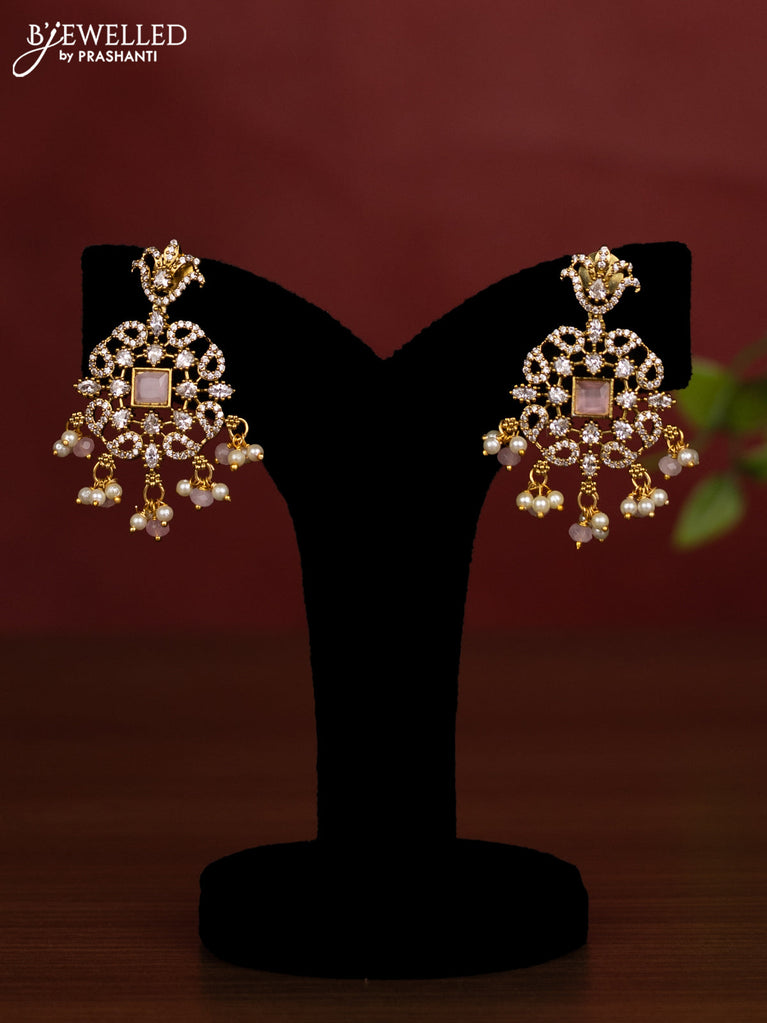 Beaded triple layer baby pink necklace peacock design with kundan & cz stones and pearl & beads hanging