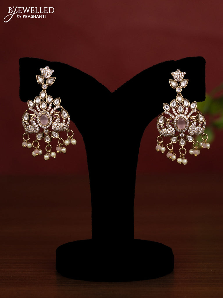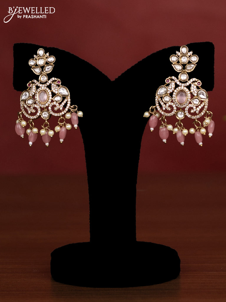 Beaded triple layer baby pink necklace peacock design with kundan & cz stones and pearl & beads hanging in victorian finish