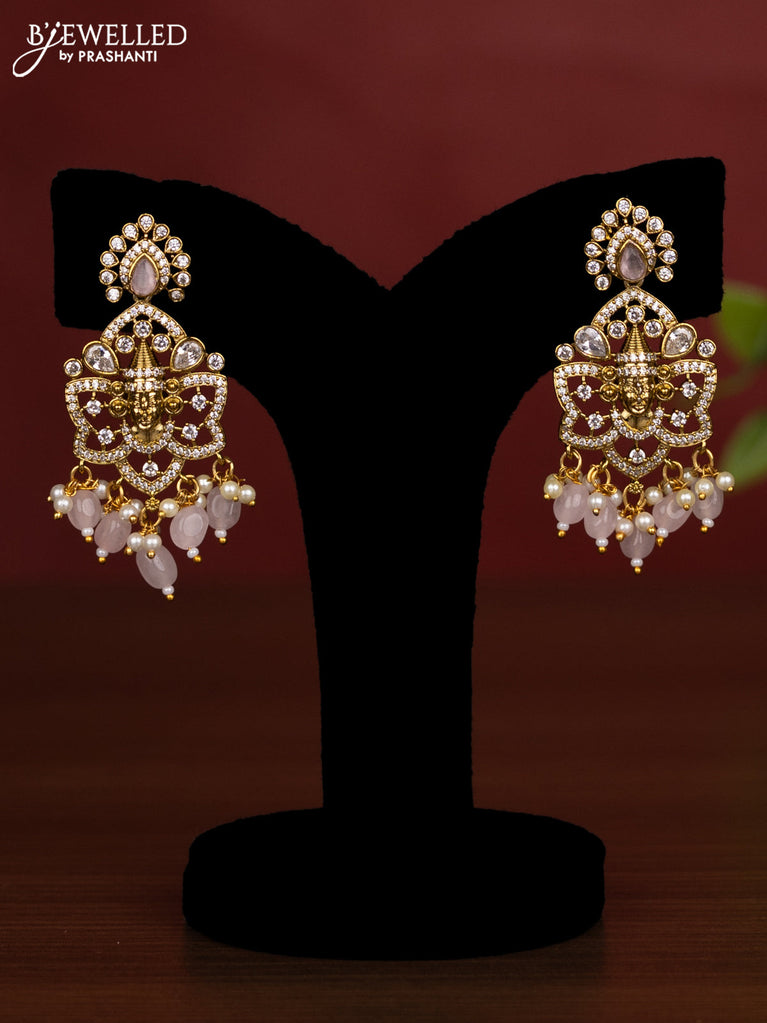Beaded triple layer baby pink necklace tiruapti balaji pendant with cz stones and pearl & beads hanging in victorian finish