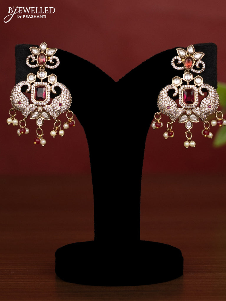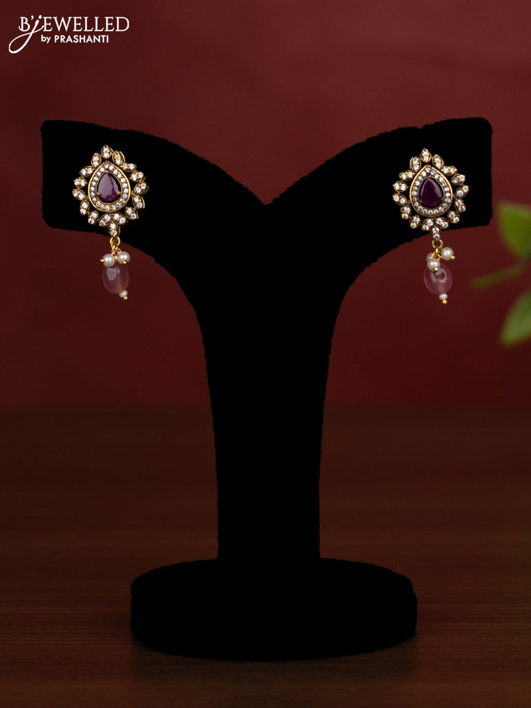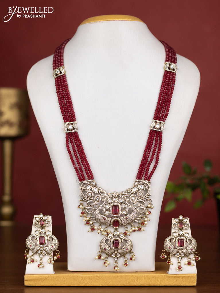 Beaded multilayer maroon necklace with ruby kundan & cz stones and pearl & beads hanging in victorian finish
