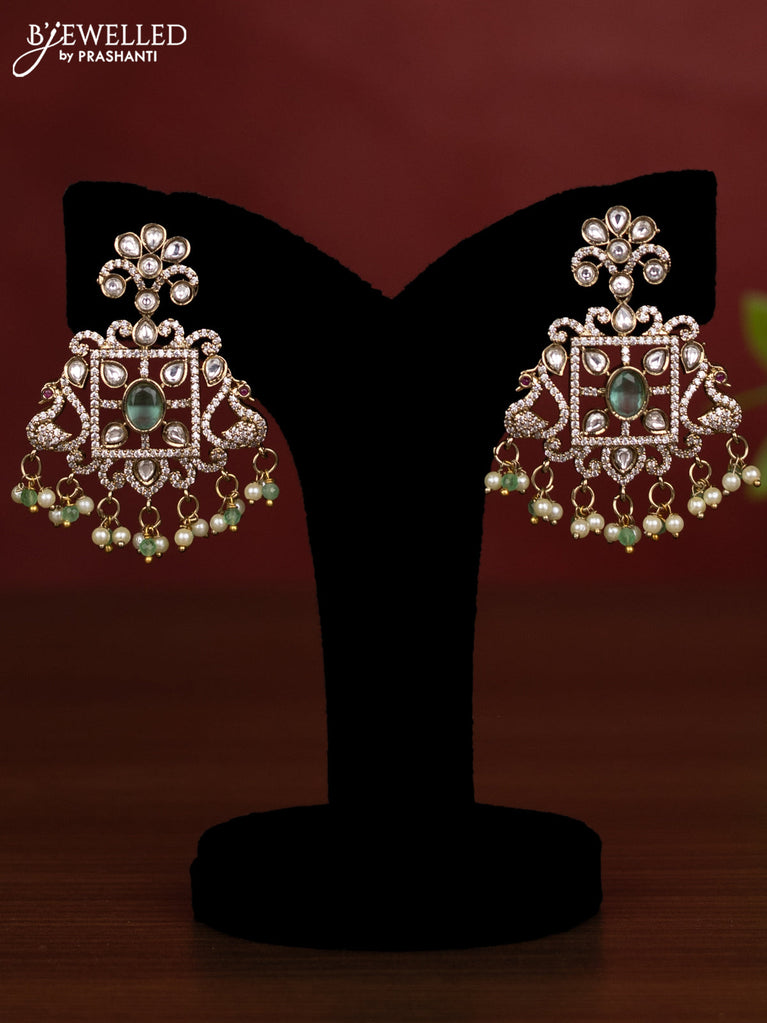 Beaded multilayer mint green necklace peacock design with kundan & cz stones and pearl & beads hanging in victorian finish