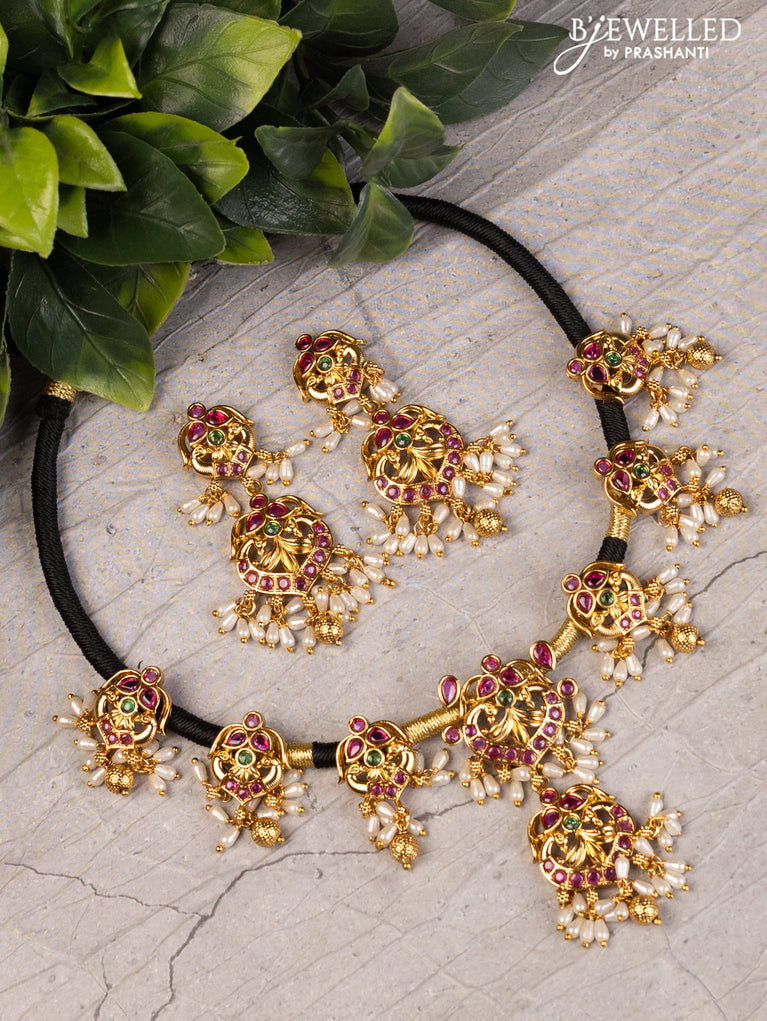 Black thread necklace with kemp stone and pearl hangings without earrings