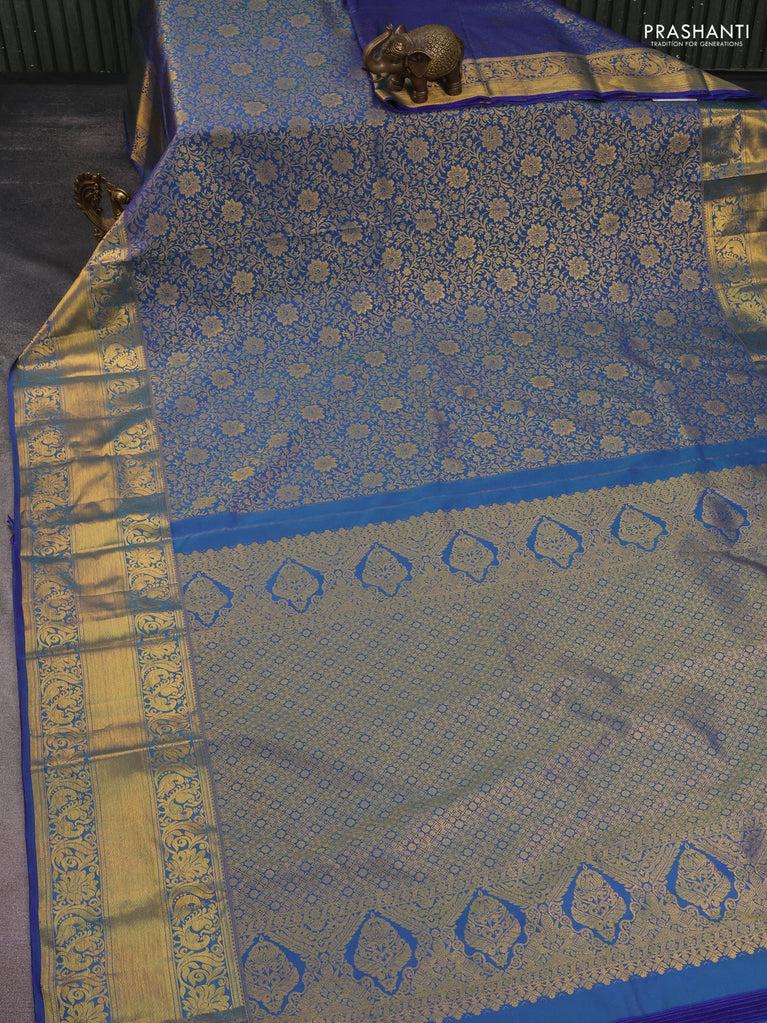 Kanchipuram silk saree dual shade of blue with allover zari woven floral brocade weaves and long rich zari woven border