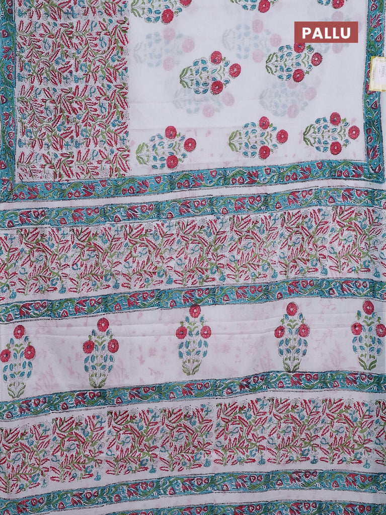 Jaipur cotton saree off white and teal blue with floral butta prints and printed border