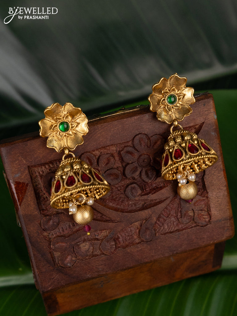 Antique jhumka with pink kemp & cz stones and pearl hangings