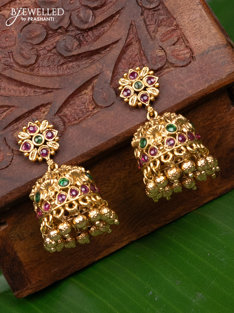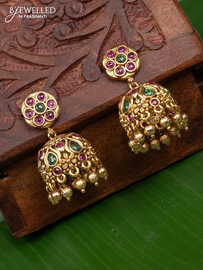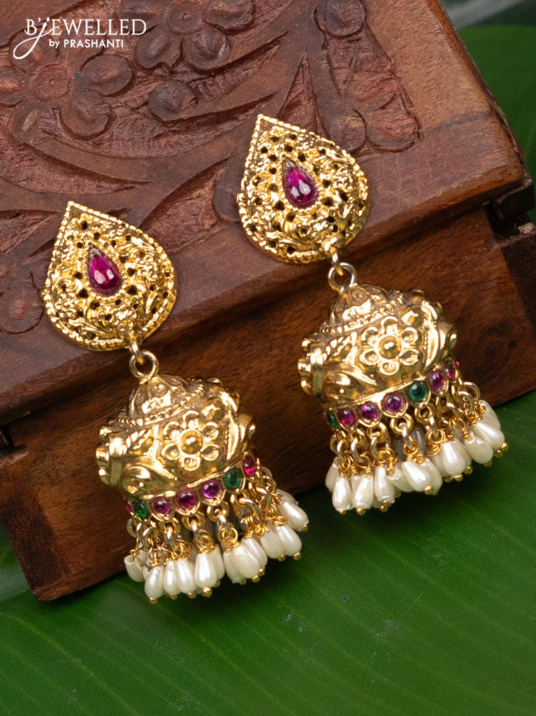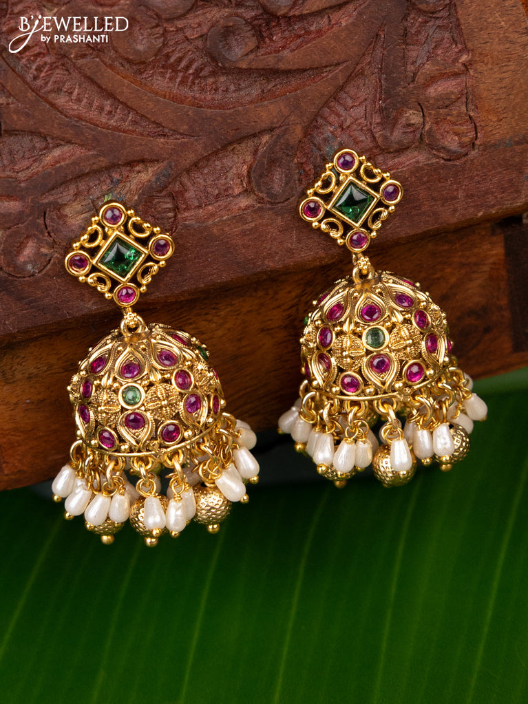 Antique jhumka with pink jadau kundan stones and pearl & beads hanging