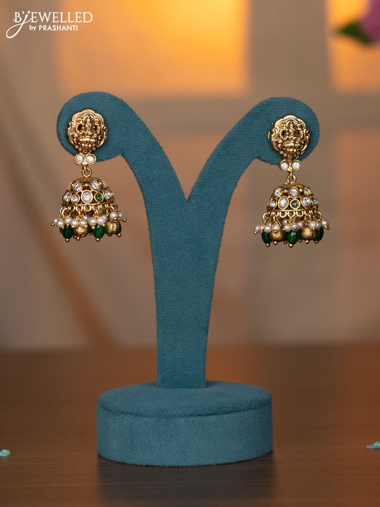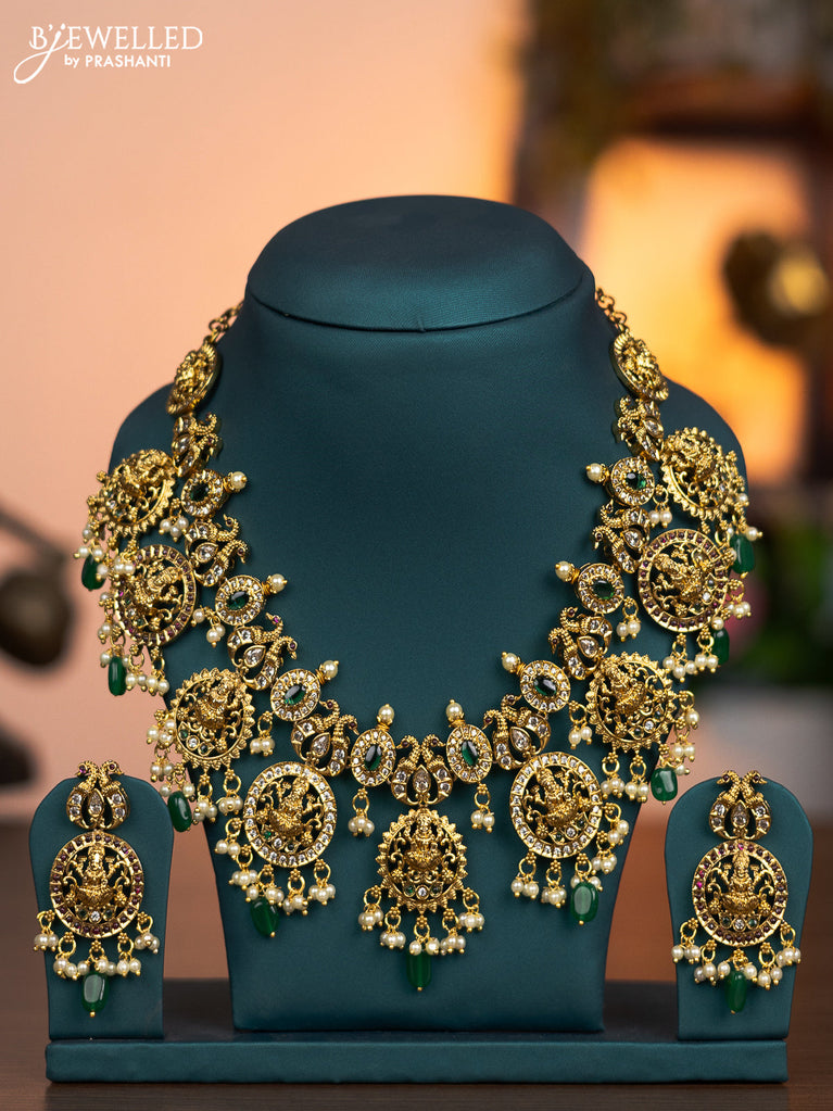 Antique necklace lakshmi design with kemp & cz stones and pearl & green beads hanging