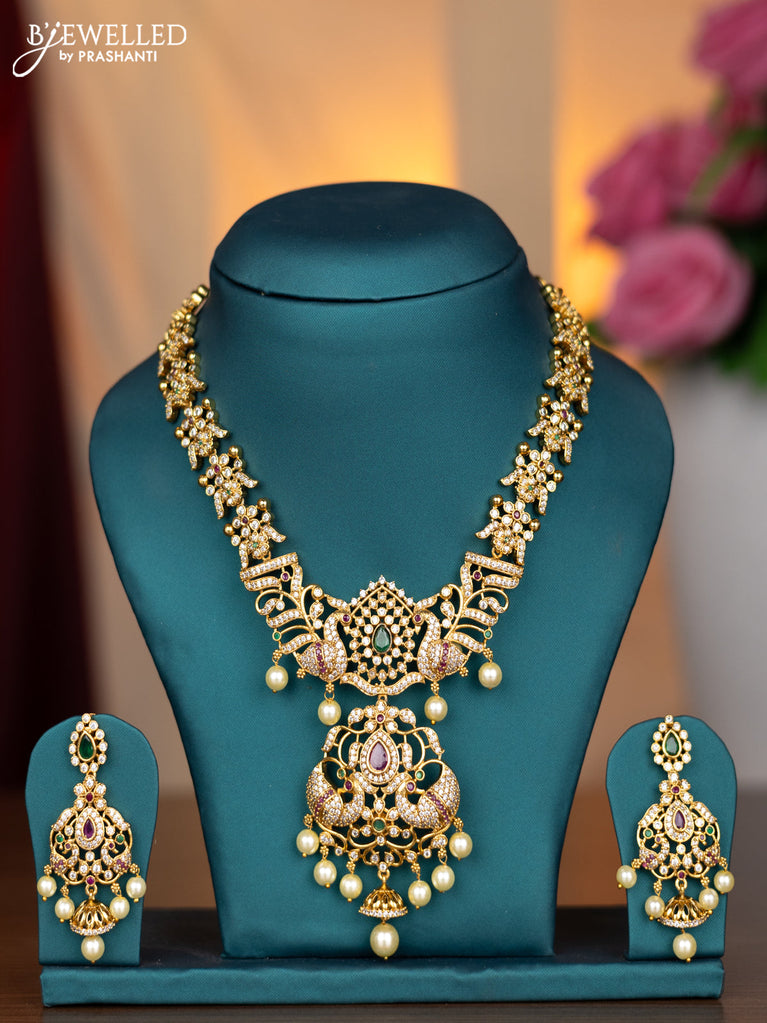 Antique necklace peacock design with kemp & cz stones and pearl hangings