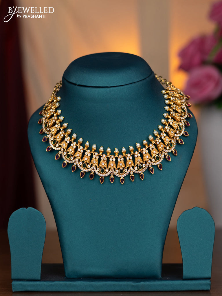 Antique necklace ramdarbar design with pink kemp & cz stones and pearls