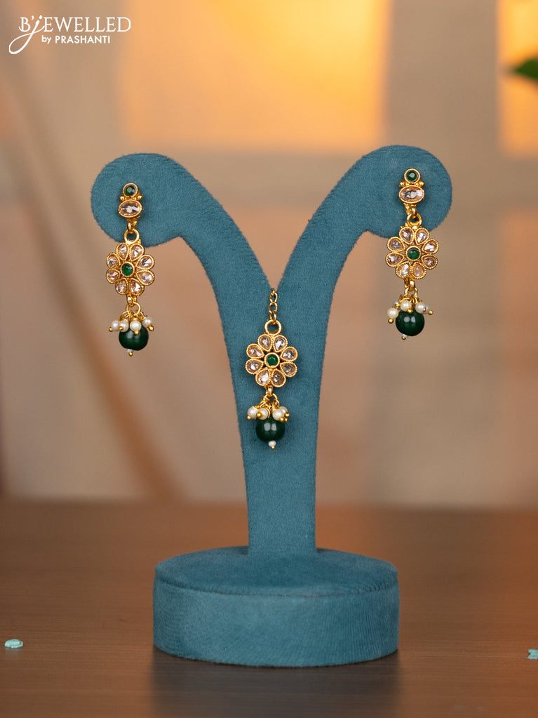 Antique necklace with emerald & cz stones and green beads hanging with maang tikka