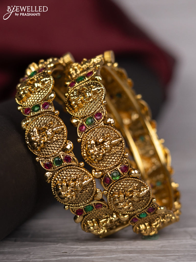 Antique screw type bangle with lakshmi design and kemp stones