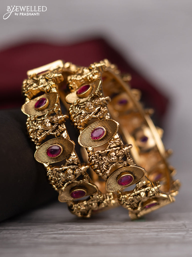 Antique screw type bangle with lakshmi design and pink kemp stones
