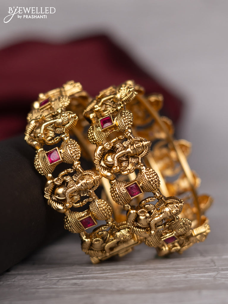 Antique screw type bangle with ganesha design and pink kemp stones