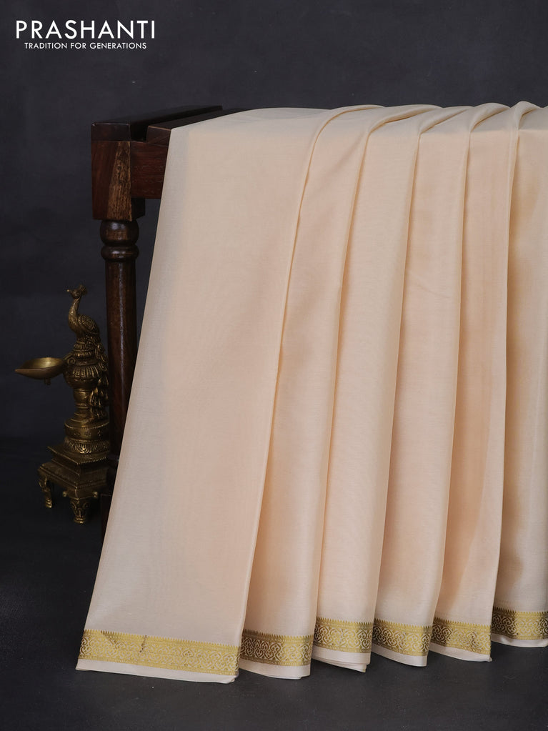 Pure mysore silk saree cream and yellow with plain body and zari woven border