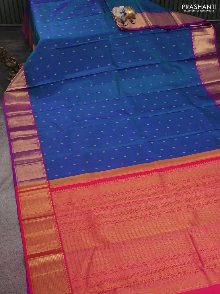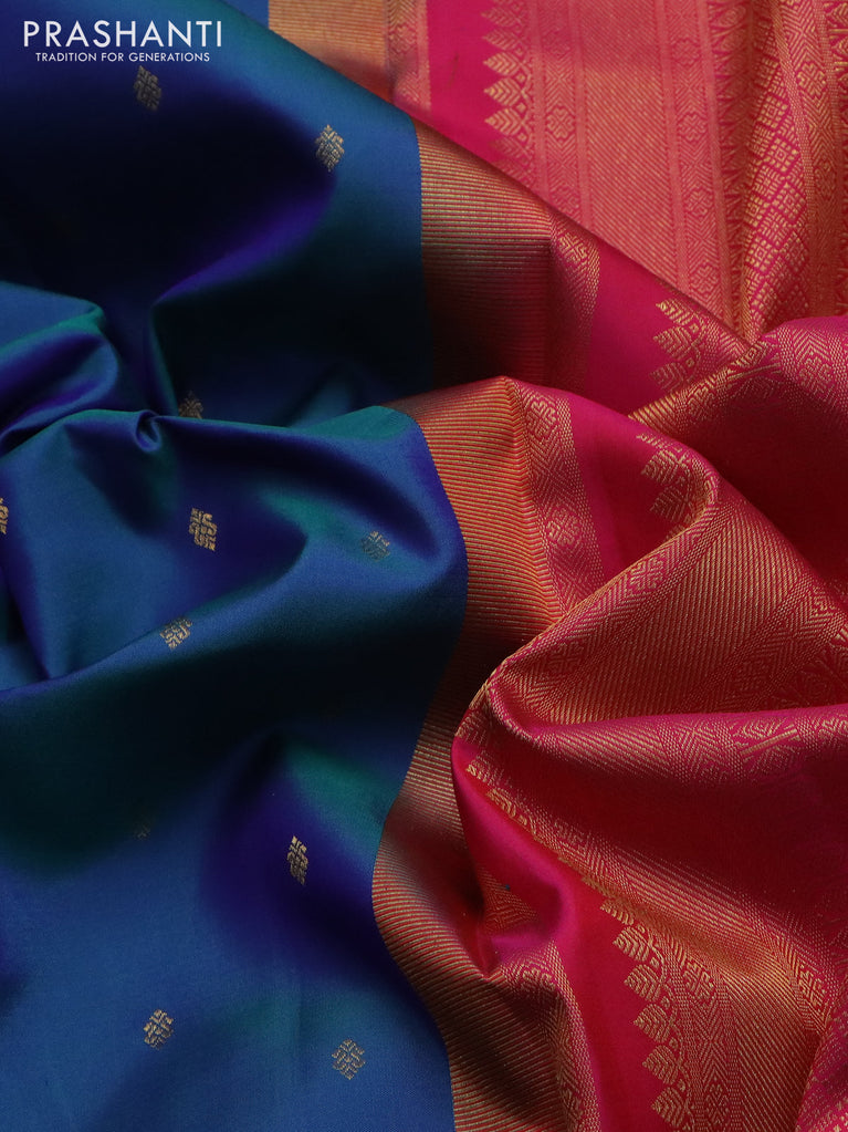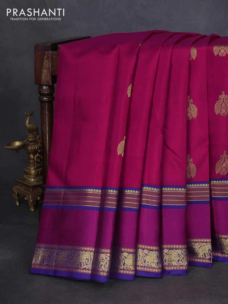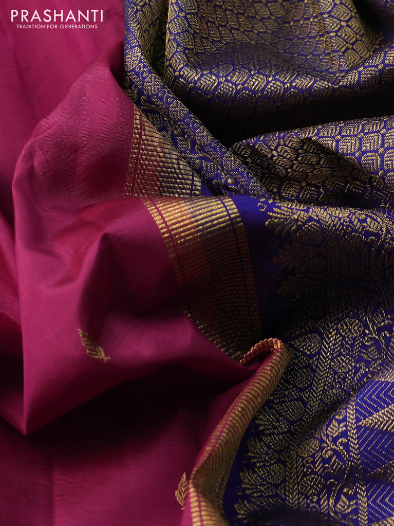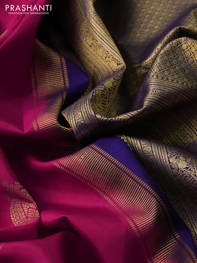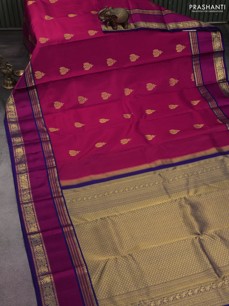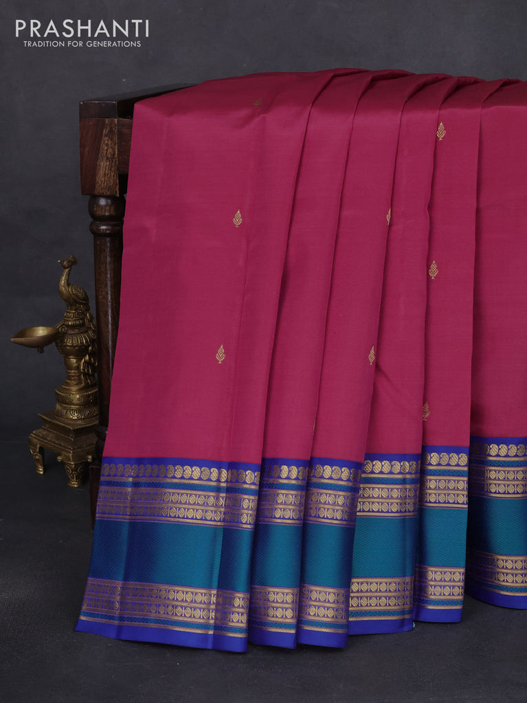 Pure kanchipuram silk saree dark magenta pink and blue with zari woven buttas and rettapet zari woven border