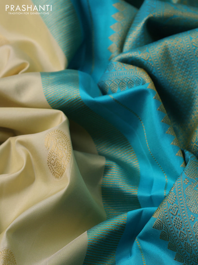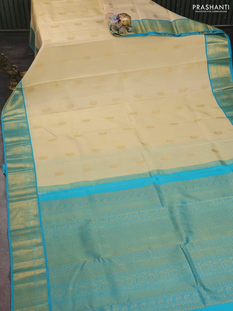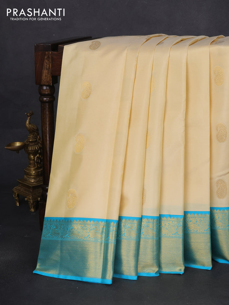 Pure kanchipuram silk saree cream and light blue with zari woven paisley buttas and zari woven border