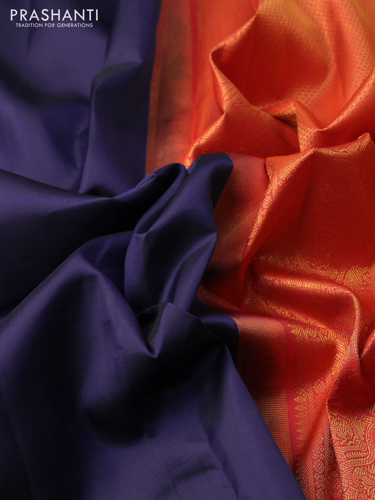 Pure kanchipuram silk saree blue and dual shade of pinkish orange with plain body and zari woven korvai border
