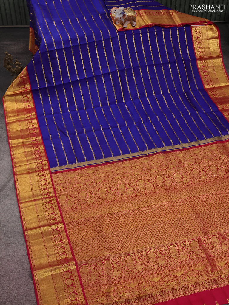 Pure kanchipuram silk saree blue and pink with allover zari woven stripes pattern and zari woven korvai border