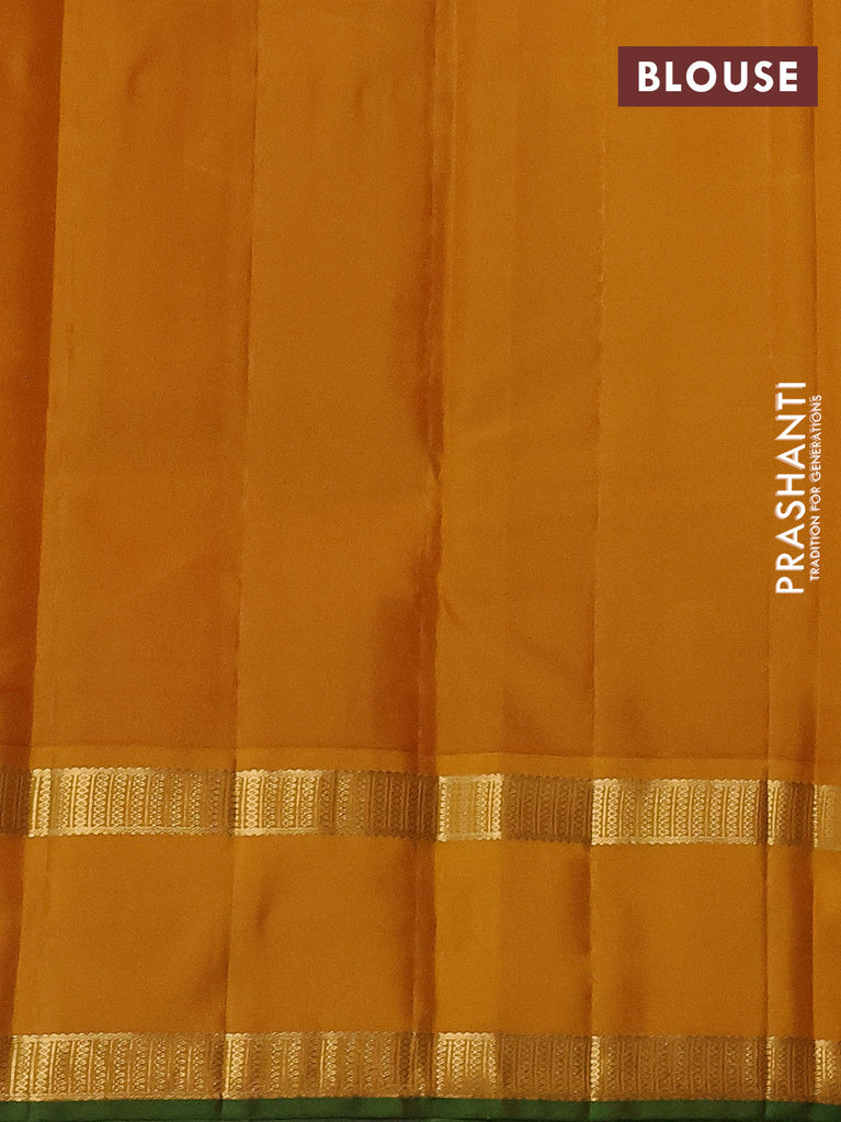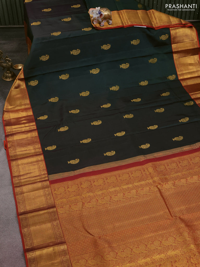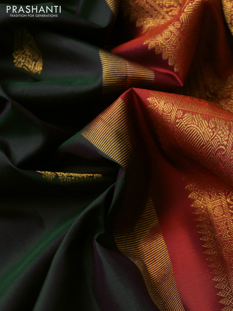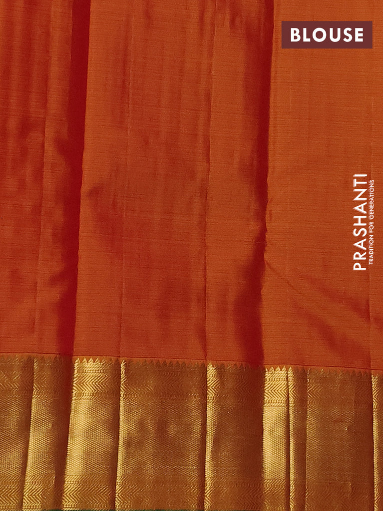 Pure kanchipuram silk saree dark green and orange with paisley zari woven buttas and zari woven border