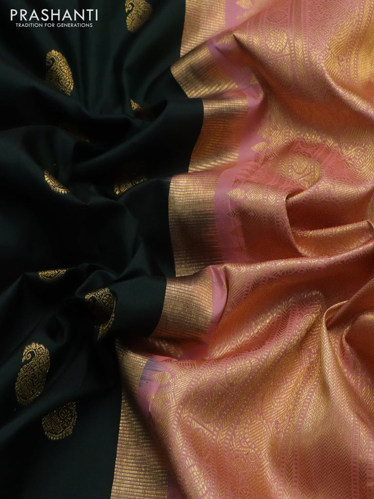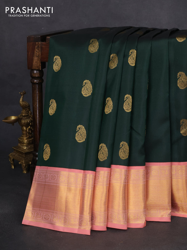 Pure kanchipuram silk saree bottle green and peach shade with paisley zari woven buttas and zari woven border