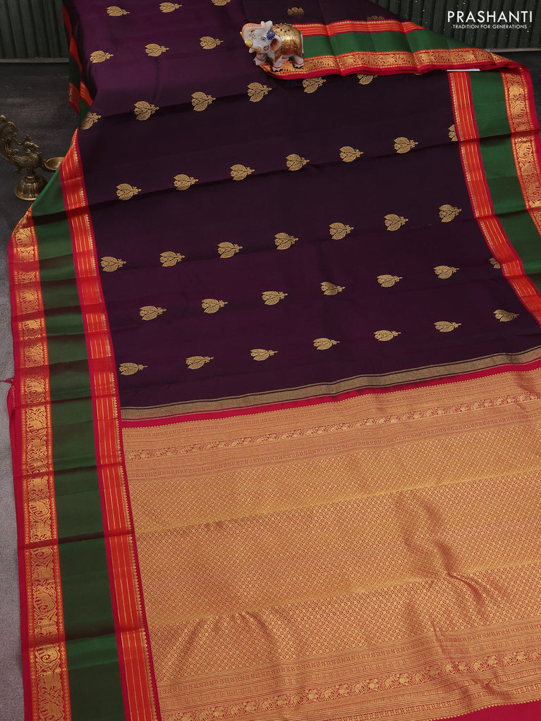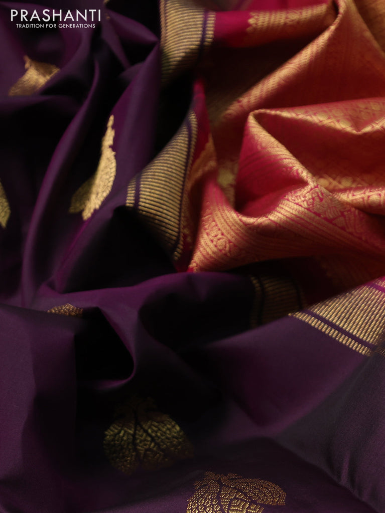 Pure kanchipuram silk saree deep jamun and pink with peacock zari woven buttas and rettapet zari woven border