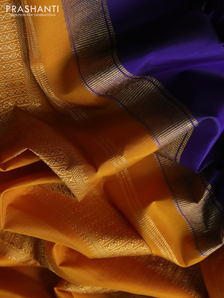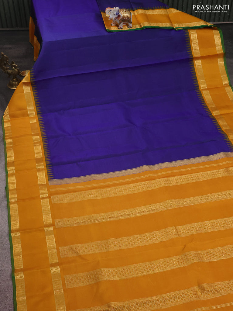 Pure kanchipuram silk saree blue and mustard yellow with plain body and temple design simple border