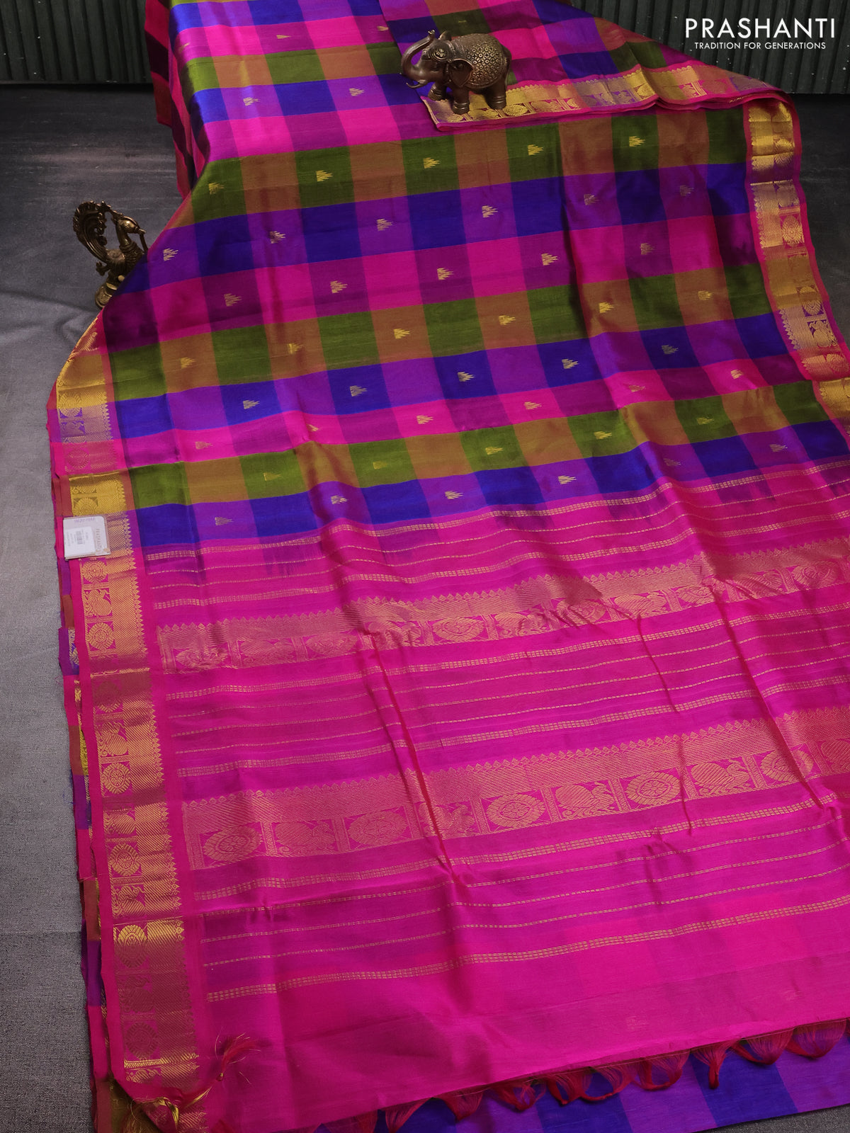 10 Yards silk cotton saree multi colour and pink with allover paalum pazhamum checks & zari buttas and rudhraksha & annam zari woven border