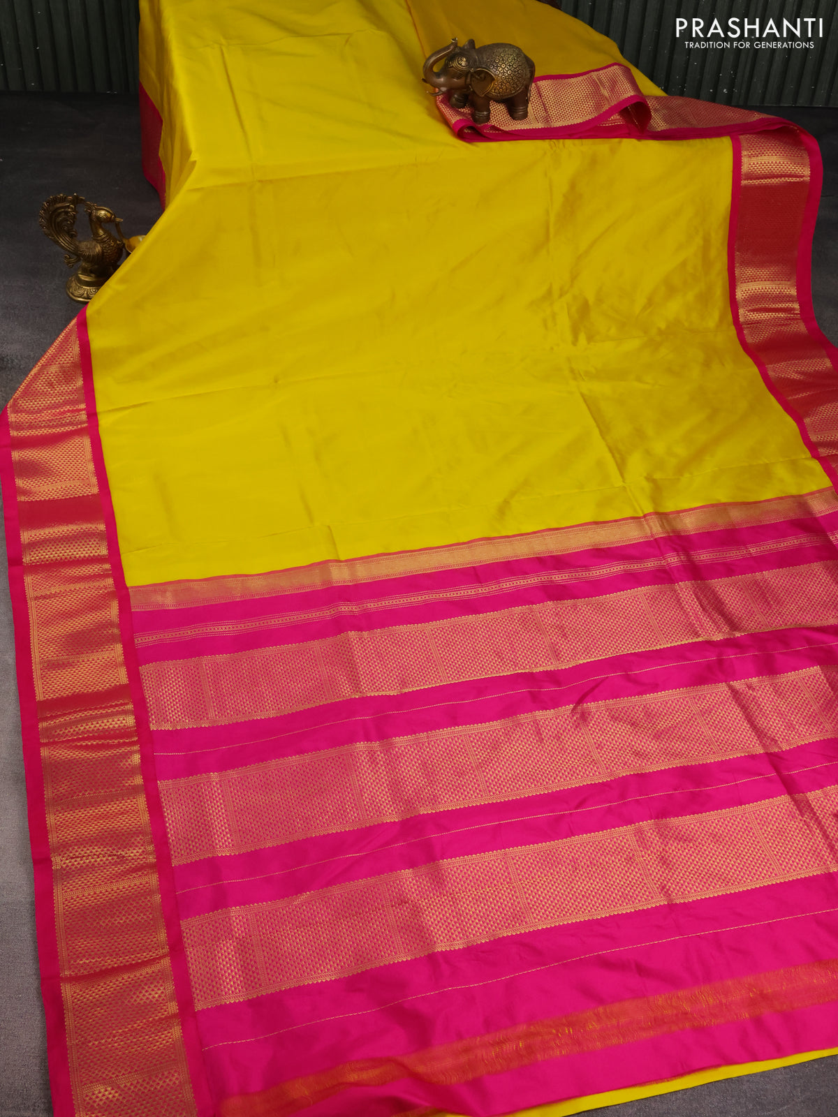 10 Yards silk saree lime yellow and pink with plain body and zari woven border