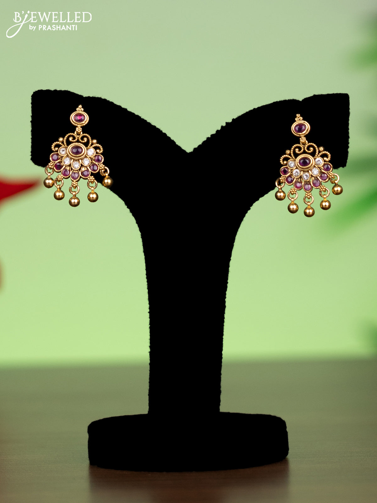 Antique attigai necklace with pink kemp & kundan stones and golden beads hanging