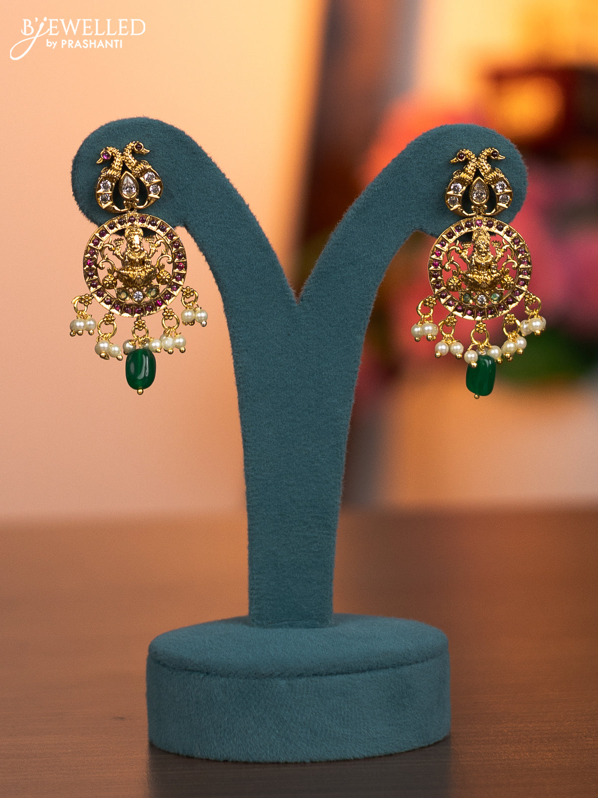 Antique necklace lakshmi design with kemp & cz stones and pearl & green beads hanging