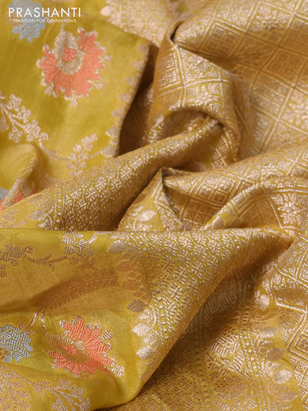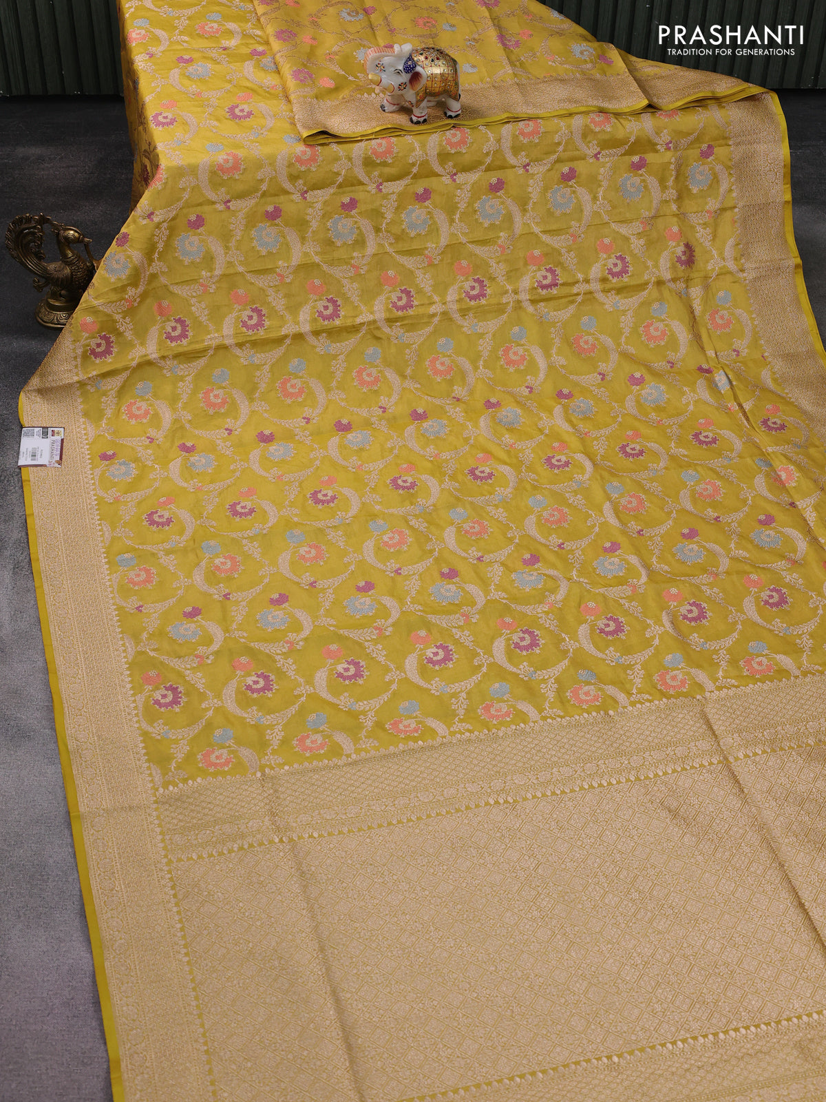 Banarasi tissue silk saree yellow with allover zari woven brocade weaves and zari woven border