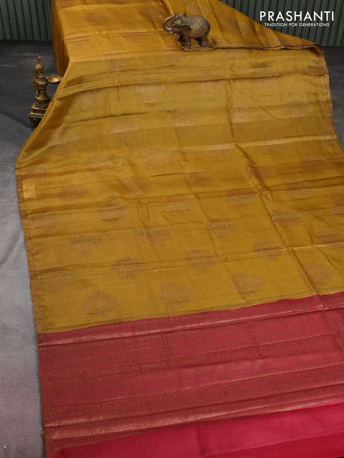 Banarasi tussar silk saree mustard yellow and maroon with thread & zari woven buttas and woven border