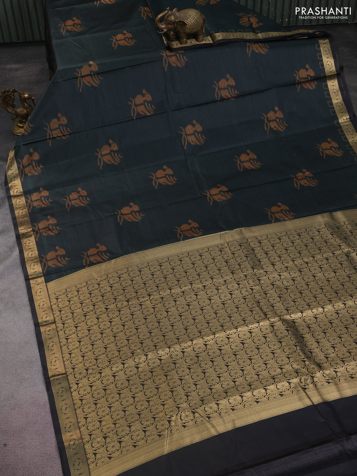 Bangalori semi silk saree bottle green with allover ikat butta weaves and zari woven border