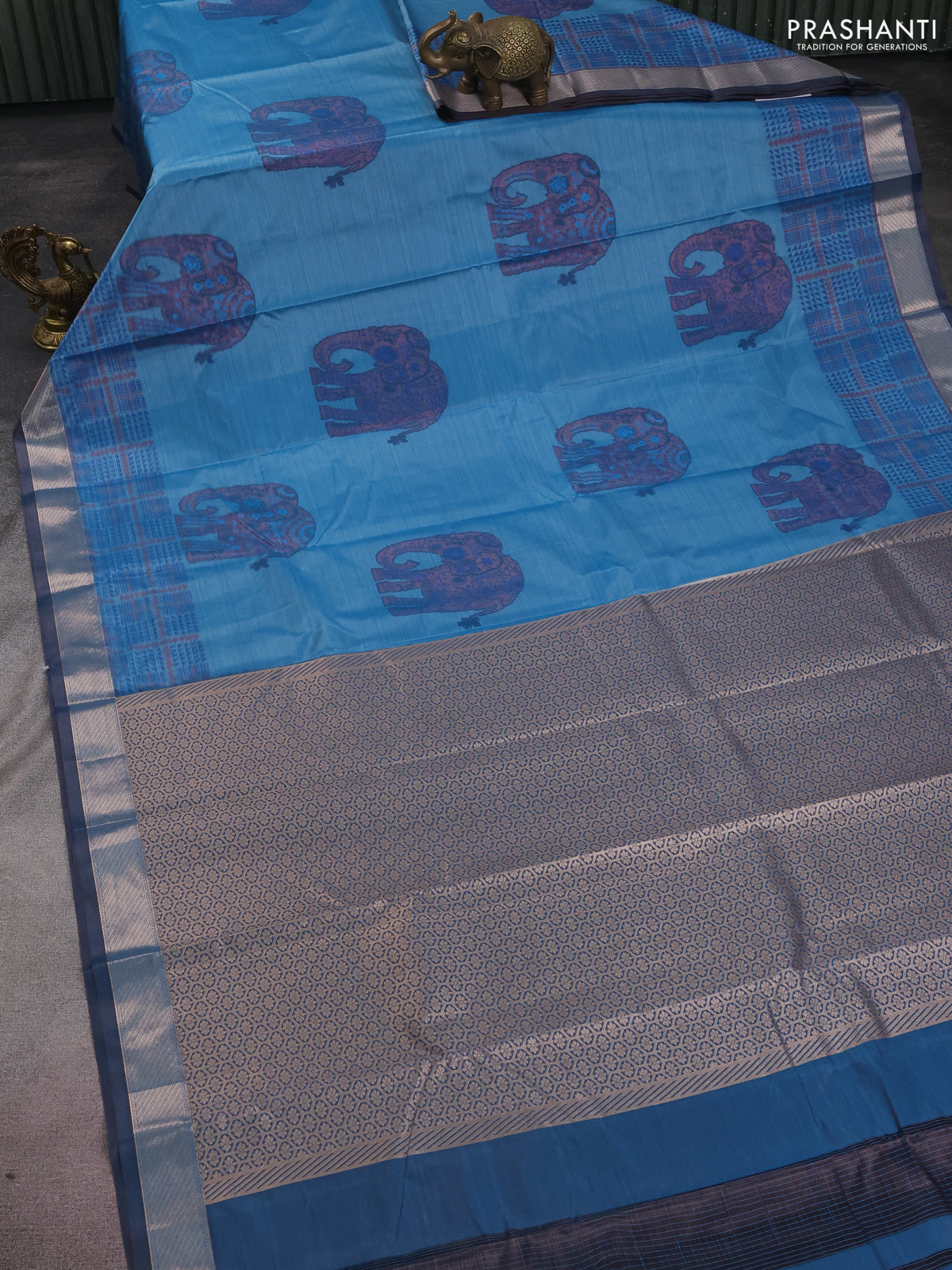 Bangalori semi silk saree teal blue with allover elephant ikat butta weaves and zari woven border