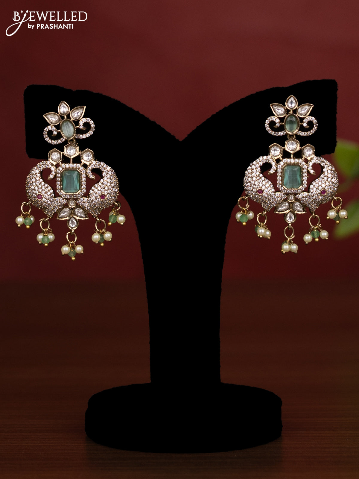 Beaded triple layer mint green necklace with kundan & cz stones and pearl & beads hanging in victorian finish