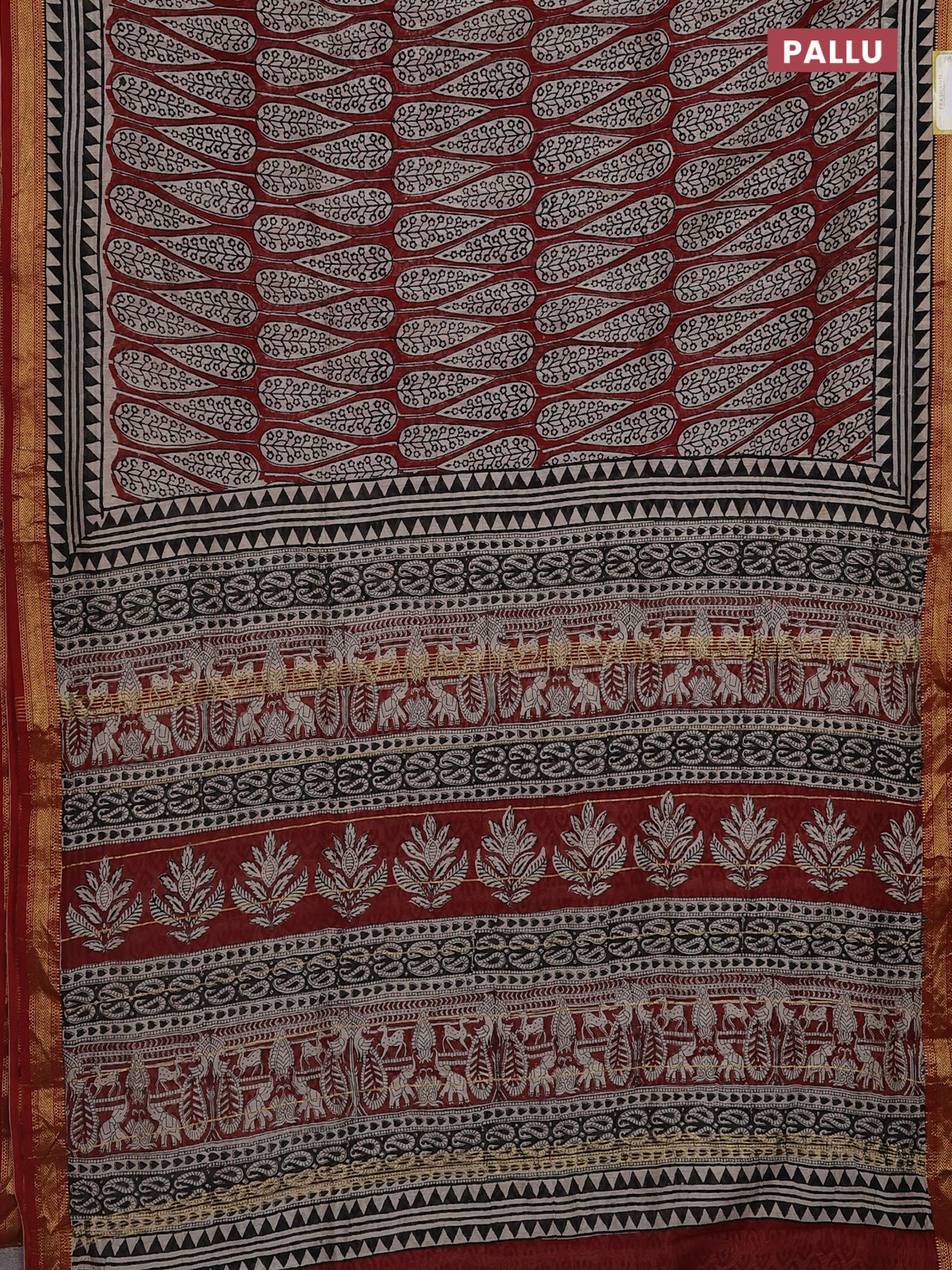 Chanderi bagru saree maroon and cream with allover prints and maheswari border