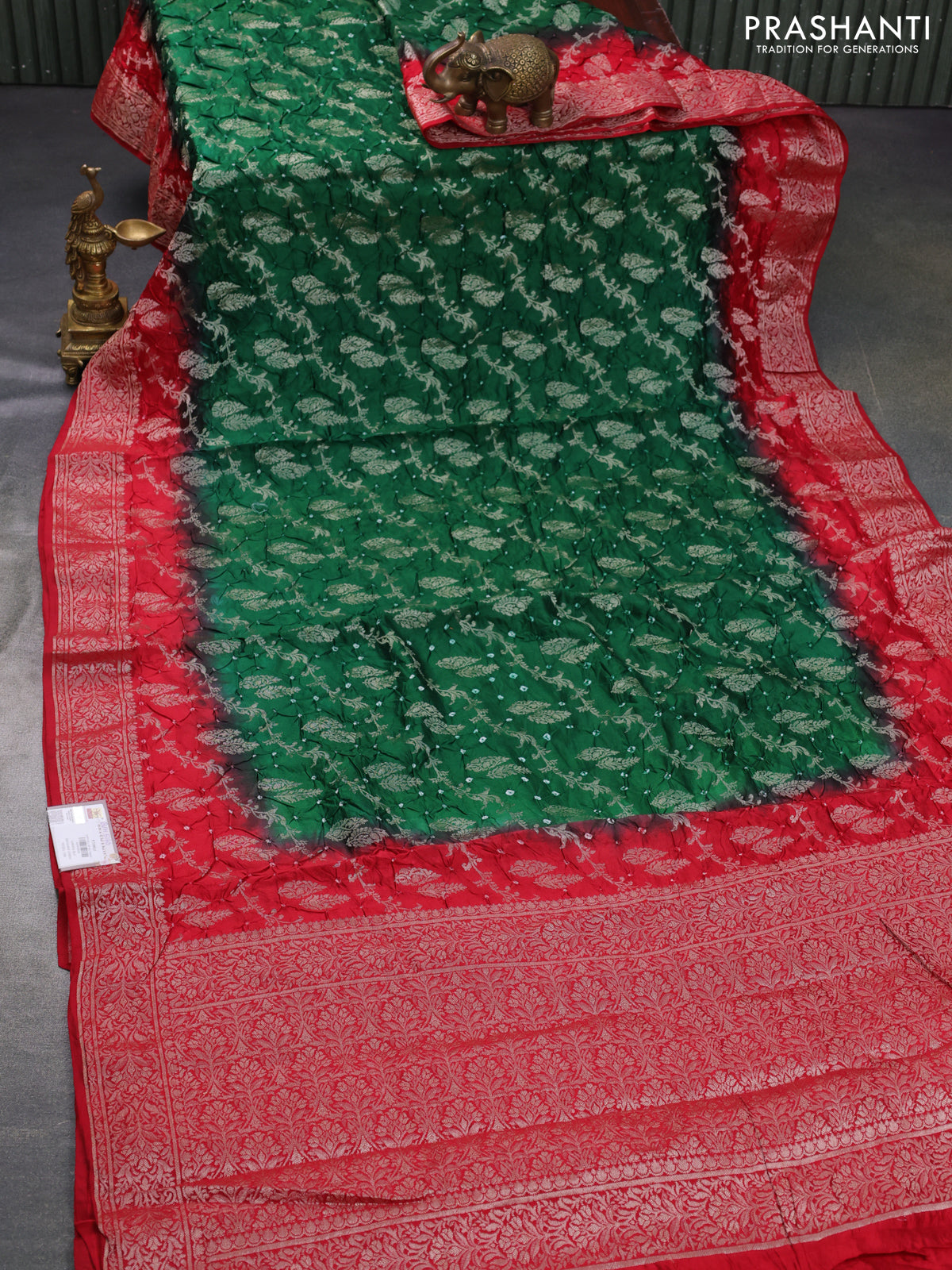 Chiniya silk saree green and red with allover bandhani prints & zari weaves and zari woven border