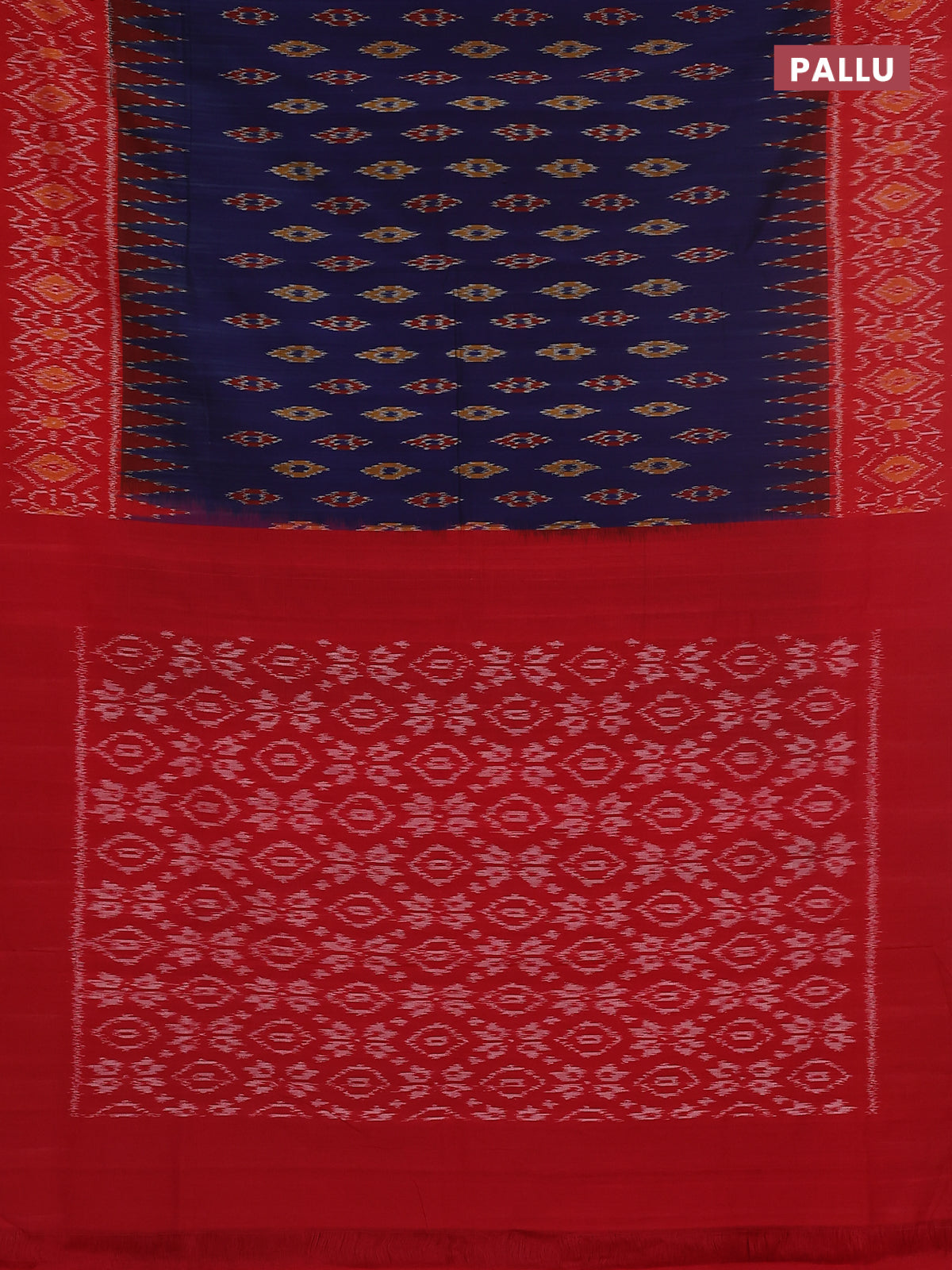 Ikat cotton saree blue and red with allover ikat butta weaves and temple design ikat style border