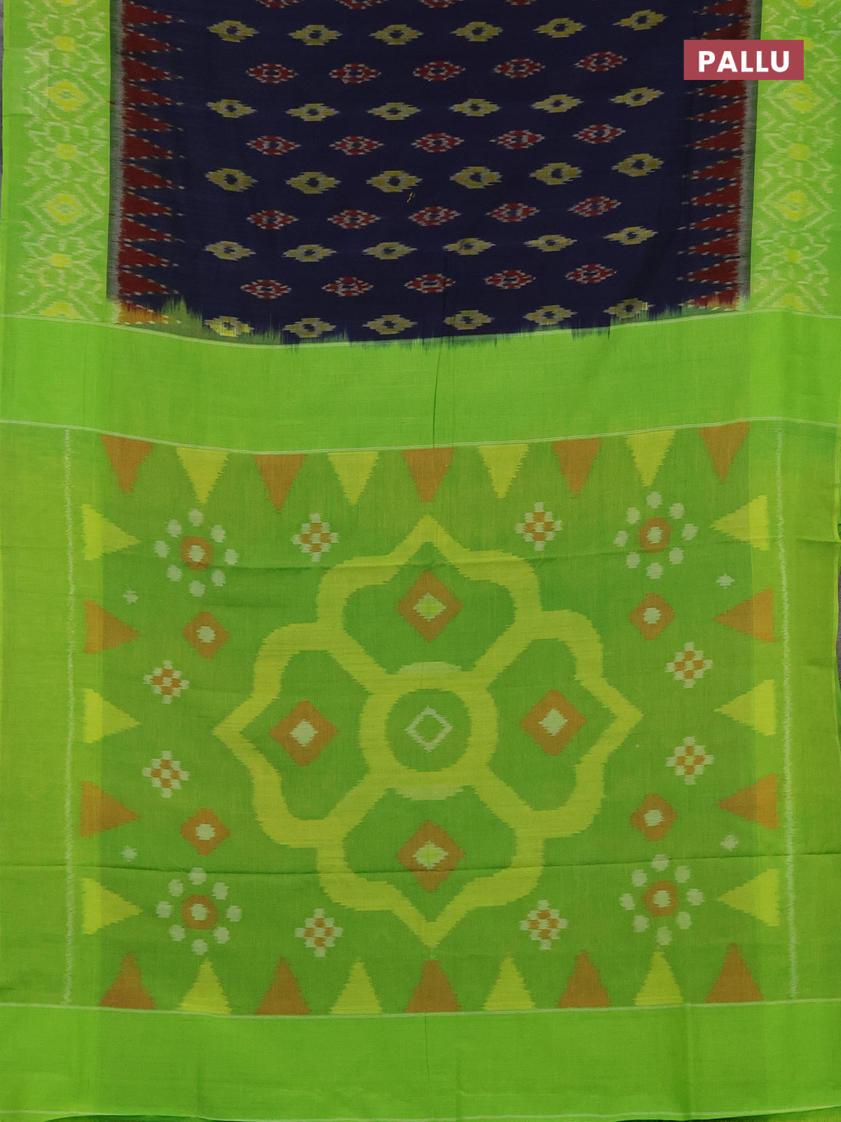 Ikat cotton saree dark blue and light green with allover ikat butta weaves and temple design simple border