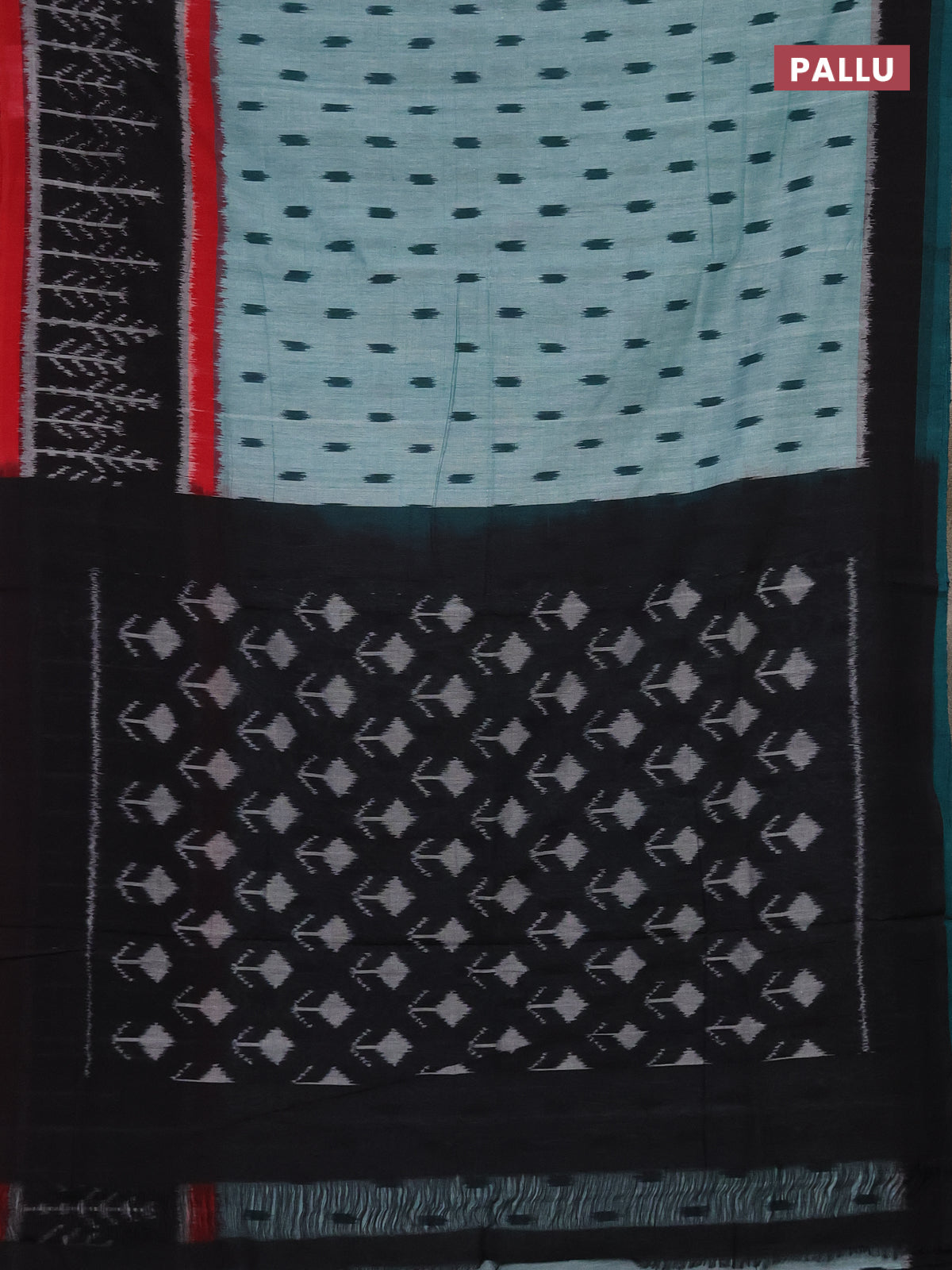 Ikat cotton saree green and black red with allover ikat butta weaves and long ikat style border
