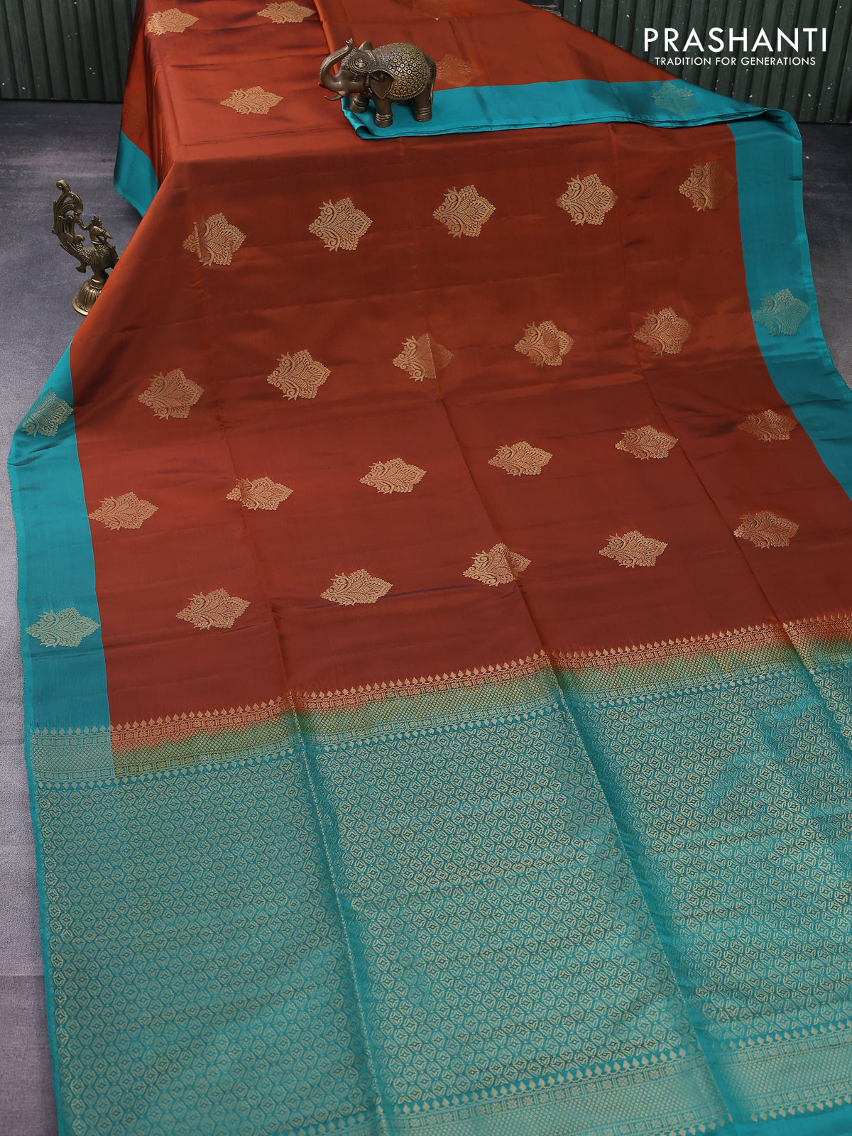 Kanchipuram soft silk saree rust shade and teal green with zari woven buttas and zari woven butta border