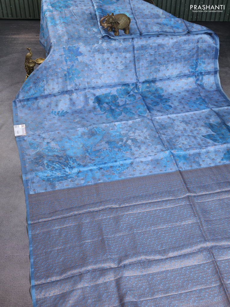 Banarasi tussar silk saree pastel blue shade with woven buttas & floral digital prints in borderless style