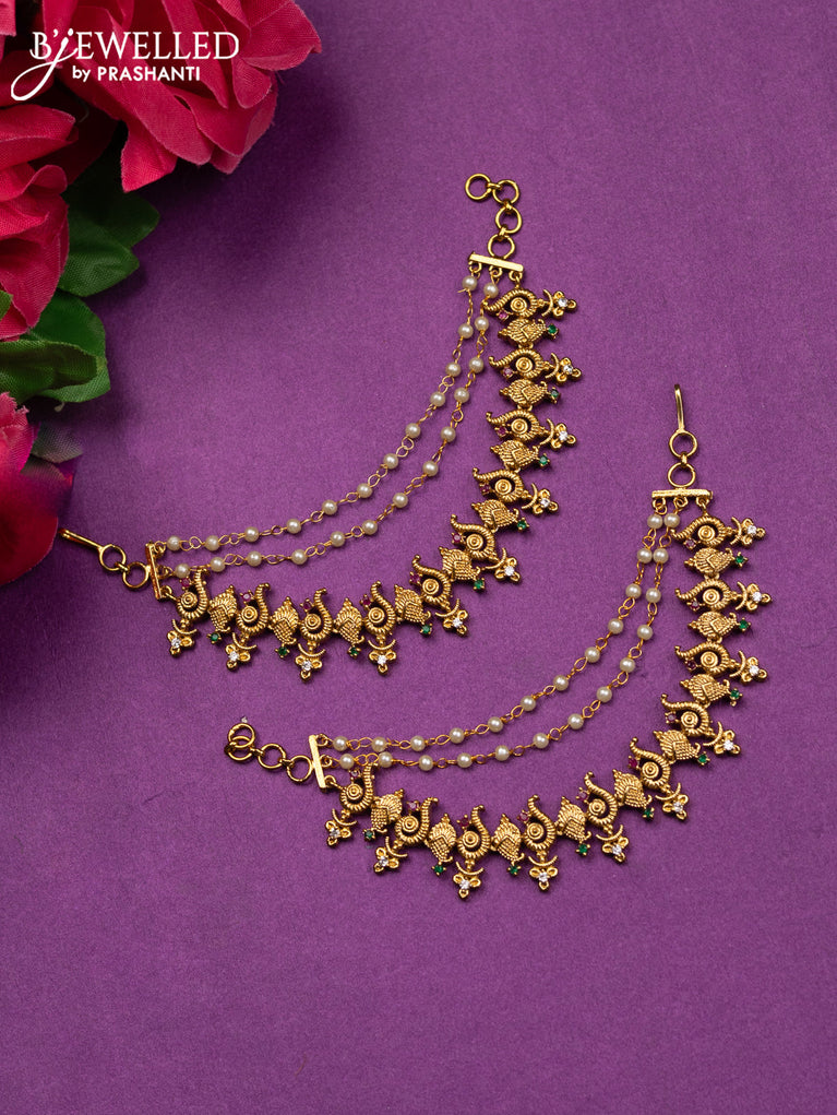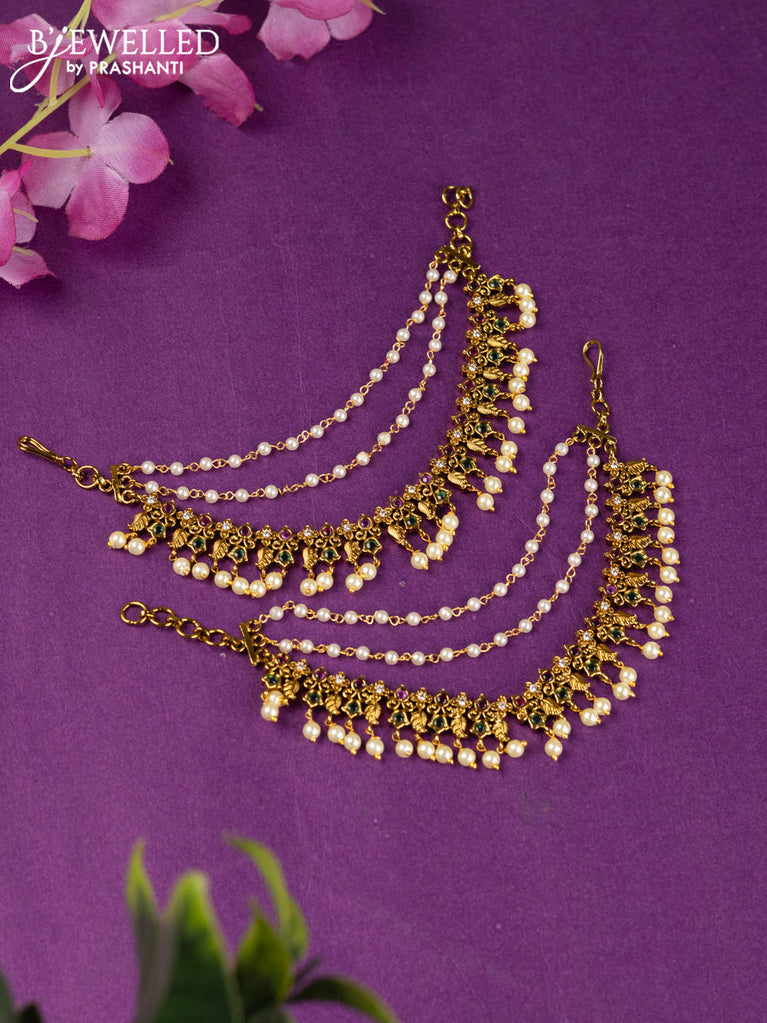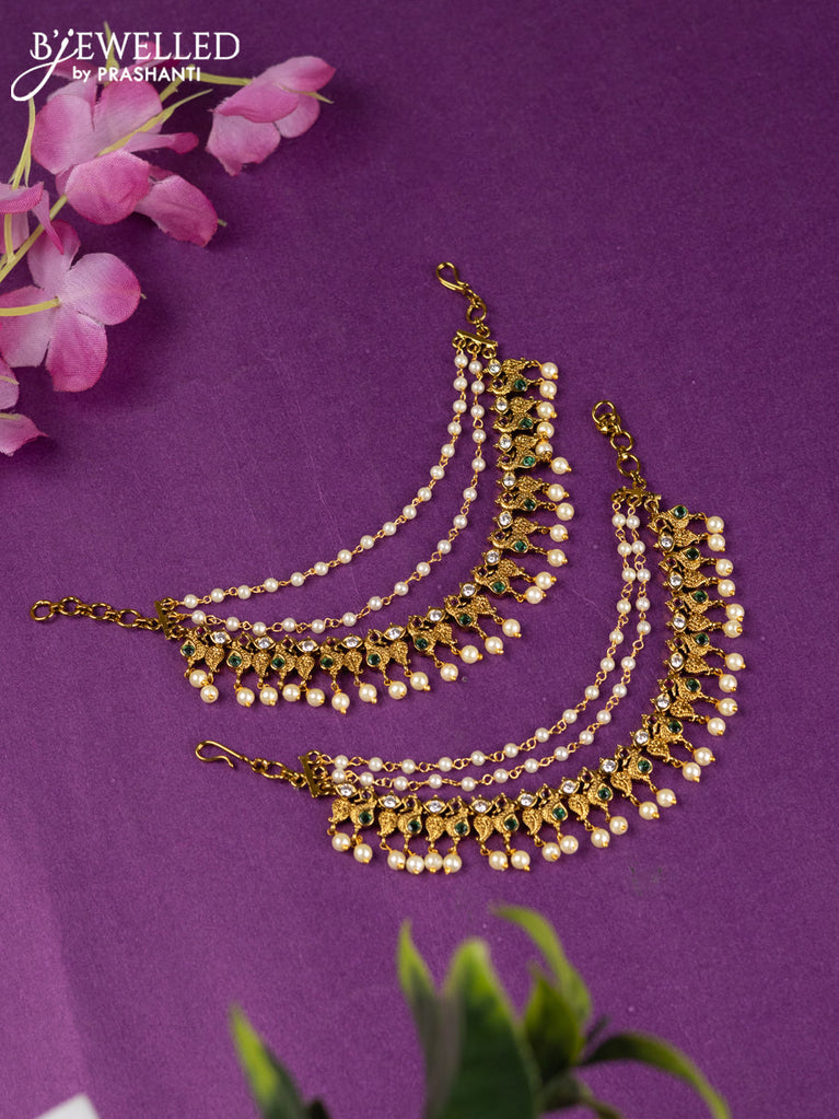 Antique triple layer maatal shanku design with kemp & cz stones and pearl hangings
