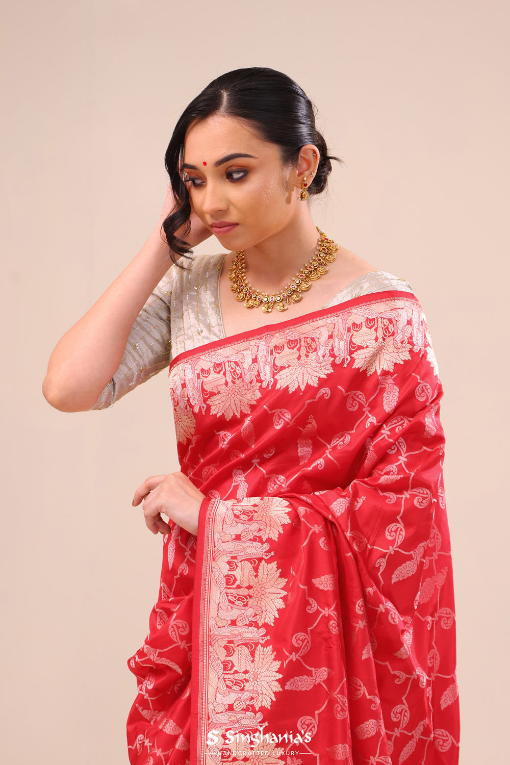 A deep red Banarasi silk saree featuring intricate peacock-traditional motifs in antique gold zari dance across the fabric, while the border, with its human-peacock figures, celebrates life. Ideal for weddings and cultural celebrations.