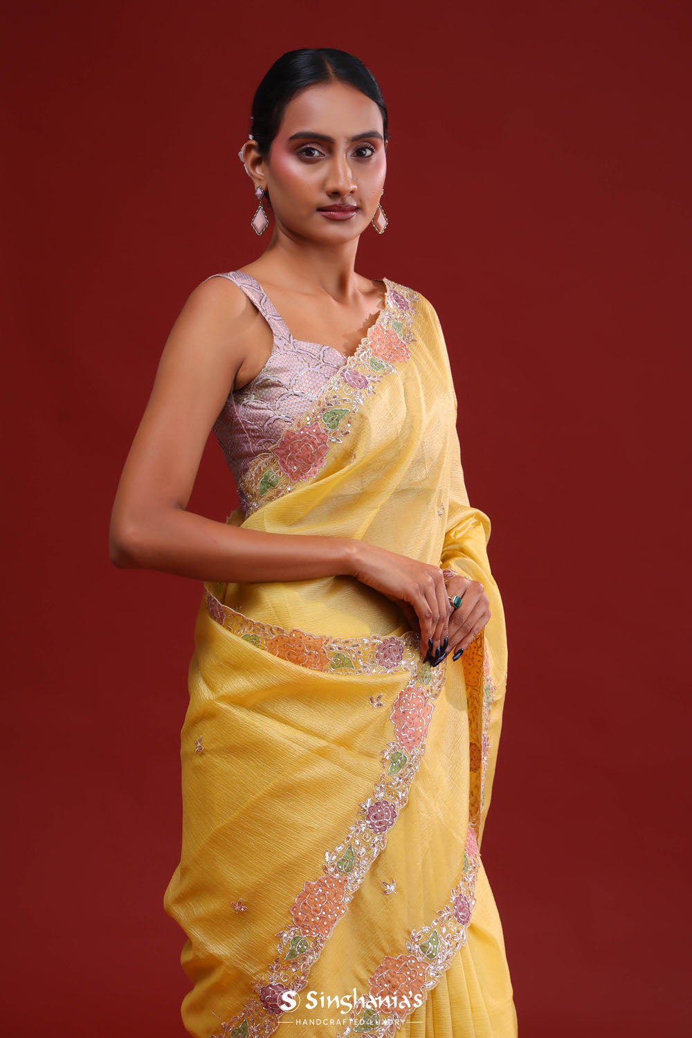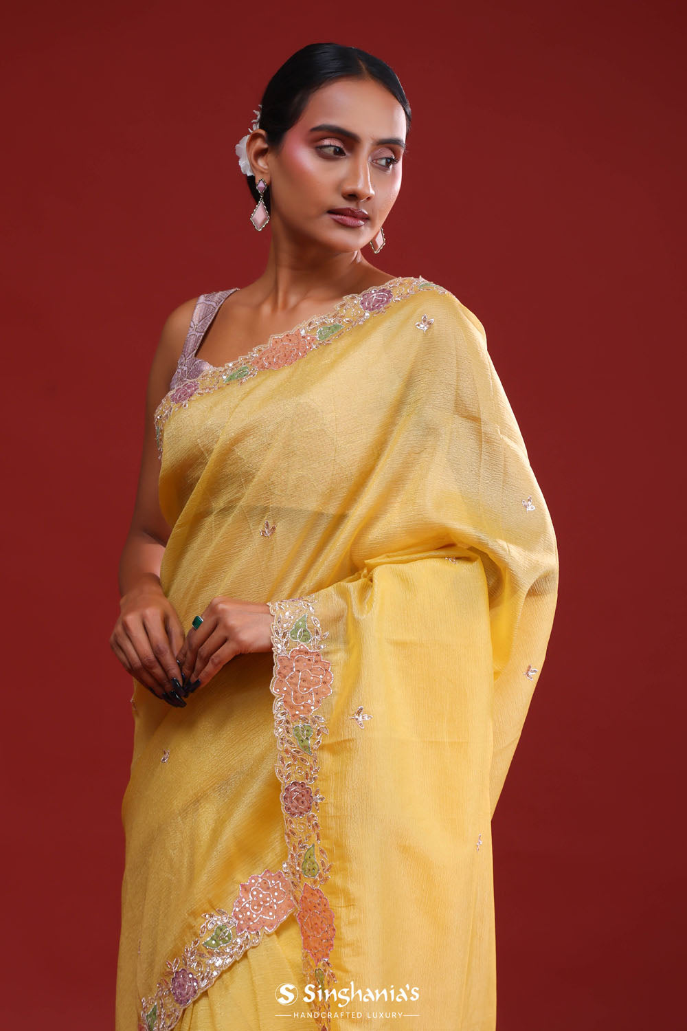 This beautiful gold yellow tissue saree is ideal for party and festive celebrations. The delicate butti work on the body, enhanced by a small floral work in applique work, sequins and glass beads, creates a luxurious and refreshing look. Includes a matching blouse piece.