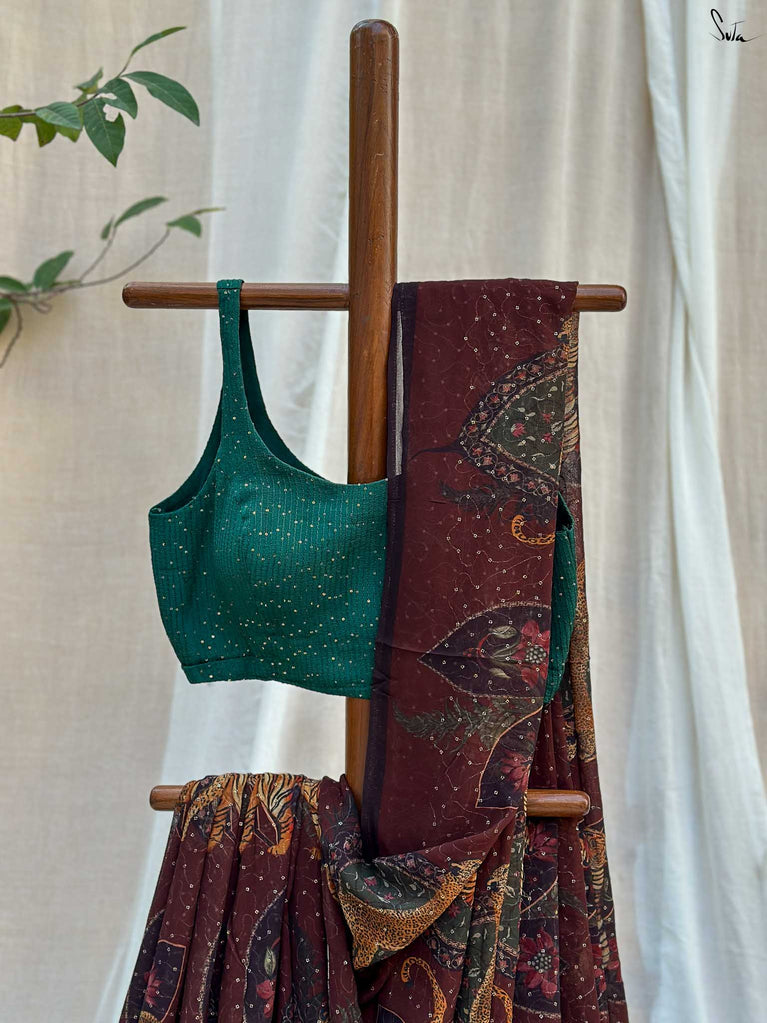 Saree: Ta, the model is wearing a size S blouse and the saree called Sitara Sa Basant