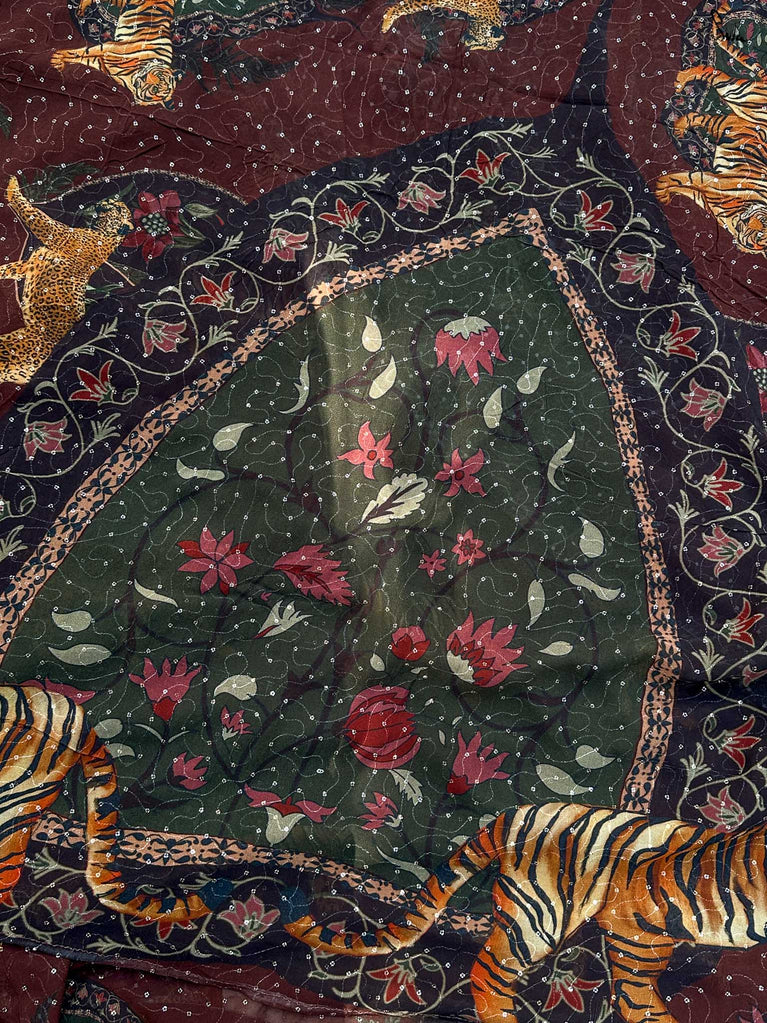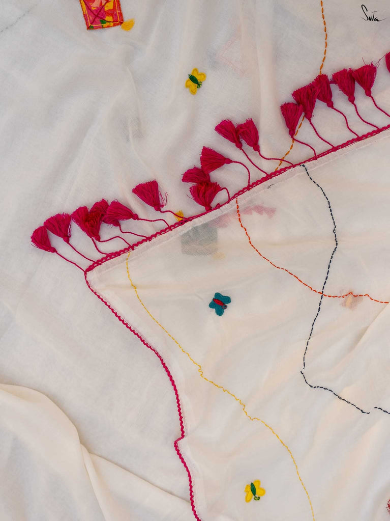 Playful, bright, and full of sky-bound dreams, this saree celebrates the joy of Basant through hand-appliqued kites in a burst of colours. The soft drape feels effortless, while the crochet lace and tassels add a sweet festive charm, like patangs dancing in a spring breeze.