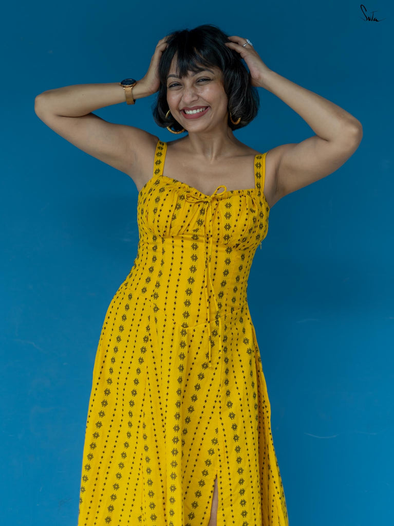 Taking inspiration from the endless hide-and-seek of the winter sunshine, the sleeveless yellow dress is as radiant as a ray of light. Woven from soft, delicate cotton fabric, the dress features a sweetheart neckline and a side zip. Embrace the beauty of 'Dhoop or Chao' and illuminate your surroundings with its warmth and energy.