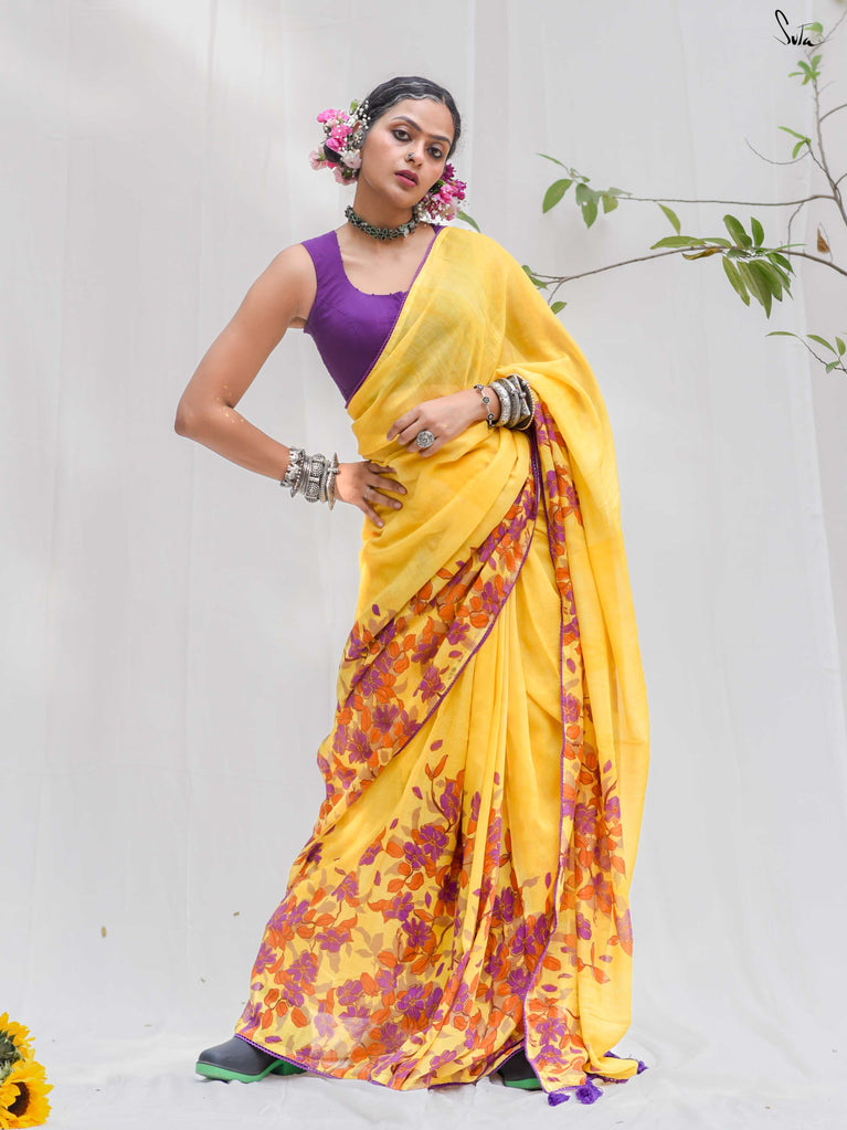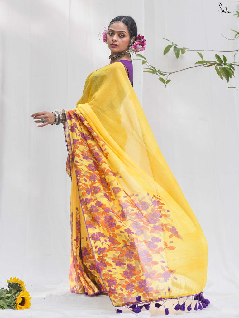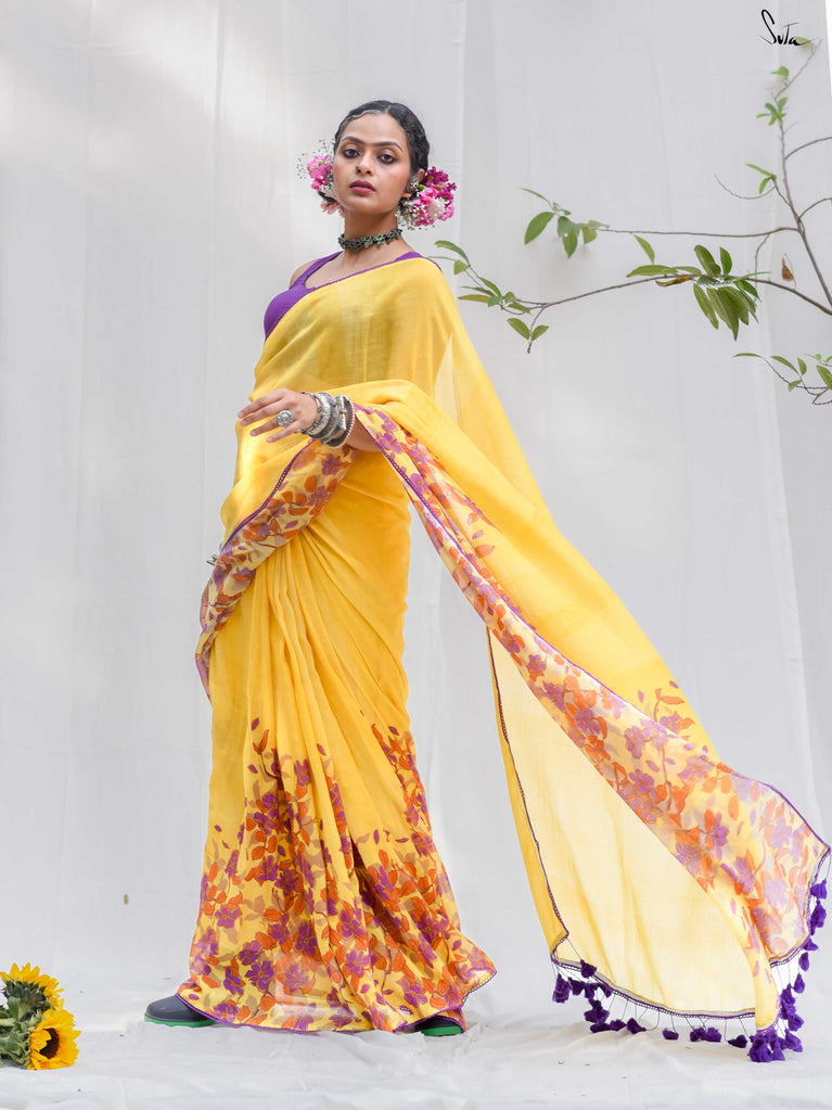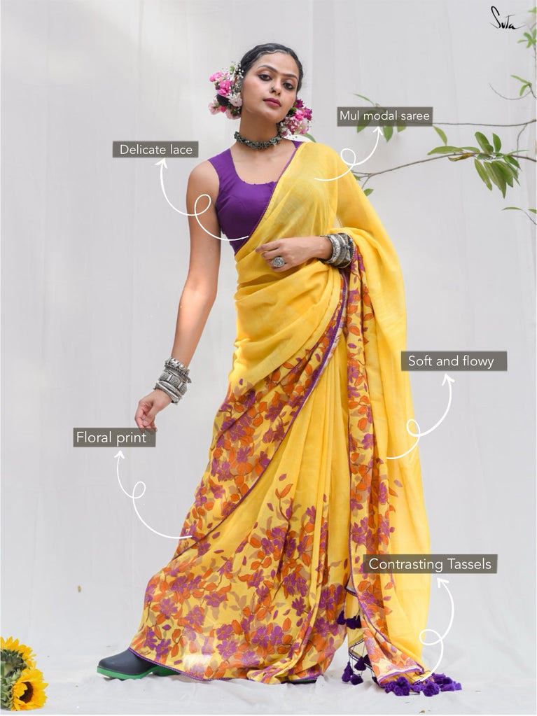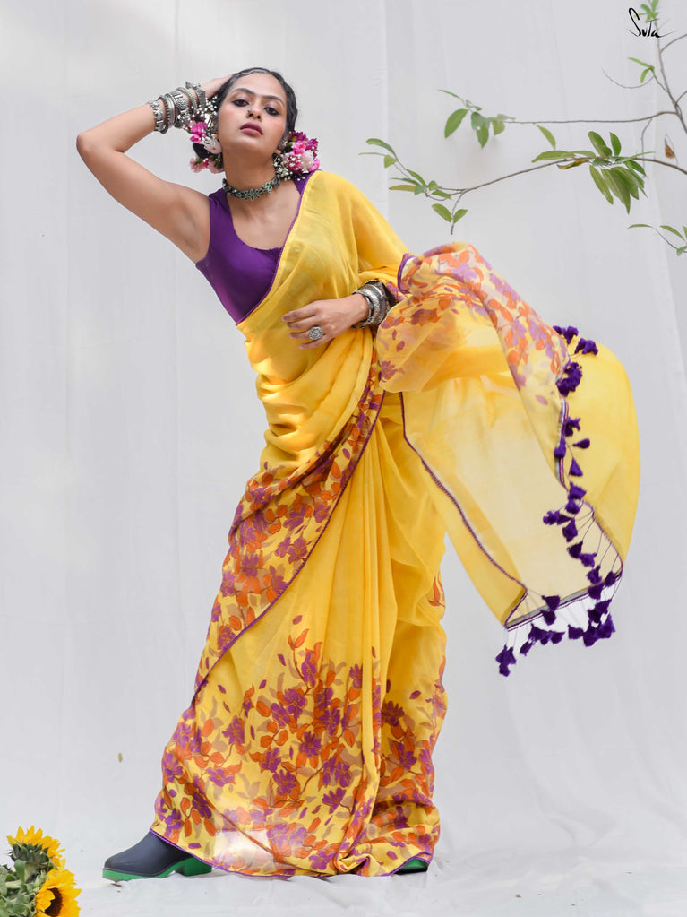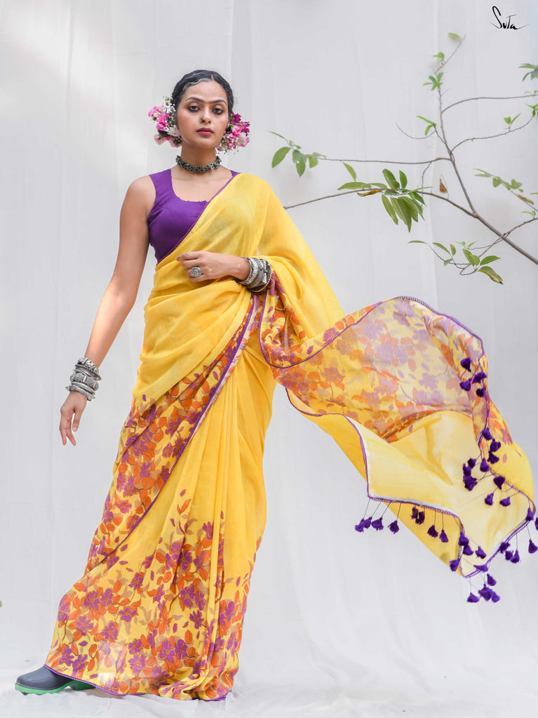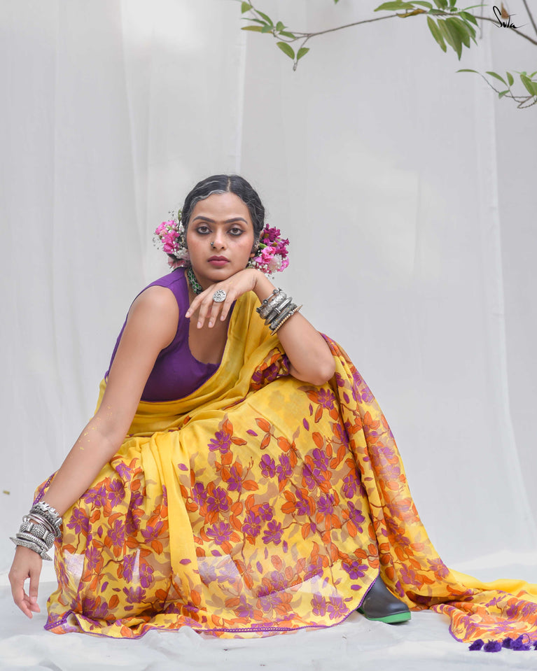 Inspired by the striking semal bloom, this saree brings together the warmth of yellow with bold, blossoming purples. The mul-modal drape is soft, fluid, and effortless, while the crochet lace and tassels add a handcrafted charm that stands out beautifully.
